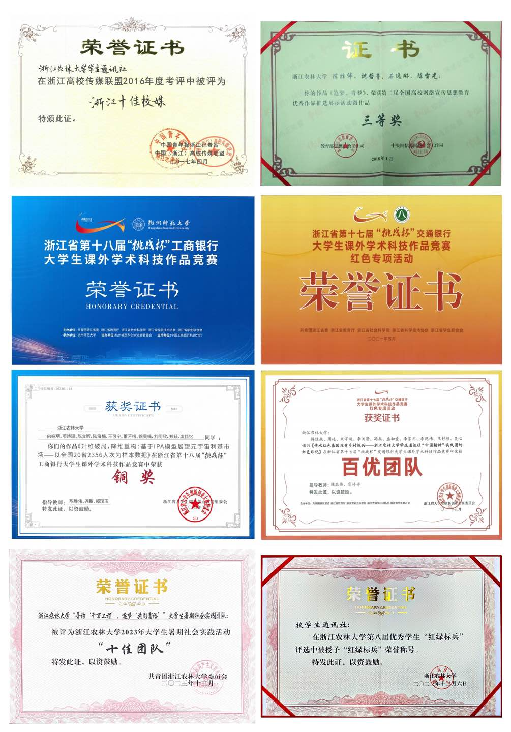 7.2023年,荣获浙江省第十八届“挑战杯”大学生课外学术科技作品铜奖;在中青校媒(浙江)开展的浙江影响力校媒巡展活动中荣获“浙江影响力校媒”;荣获浙江农林大学第八届优秀学生(集体)“红绿标兵”称号。