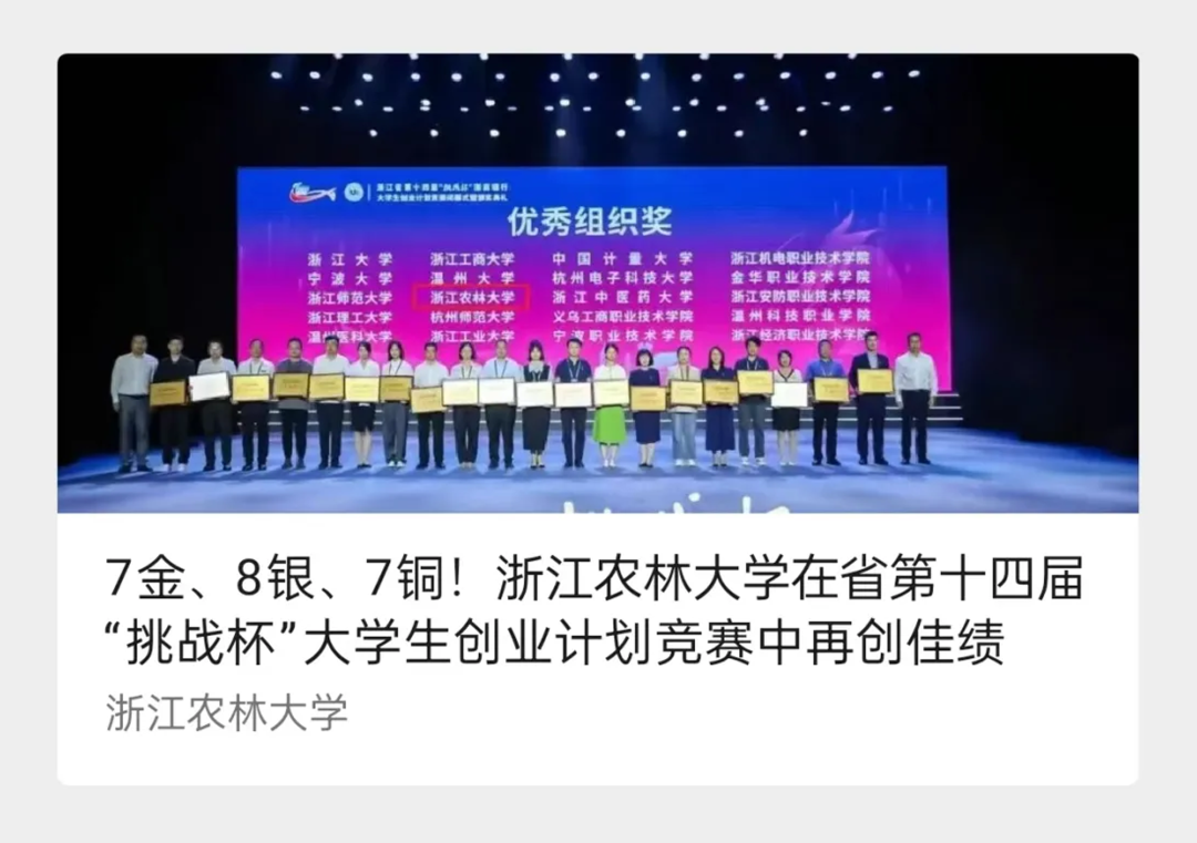 8.2024年,荣获“浙江省十佳校媒”称号,两支团队在浙江农林大学第十七届“东湖杯”大学生创业计划竞赛获得二等奖。