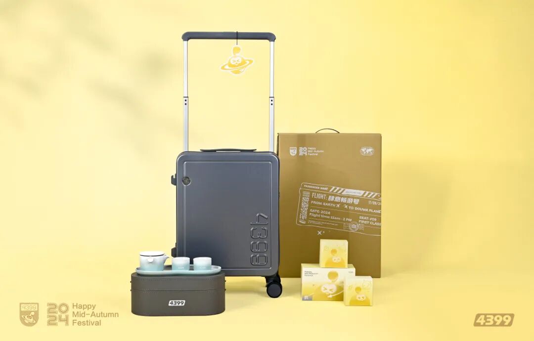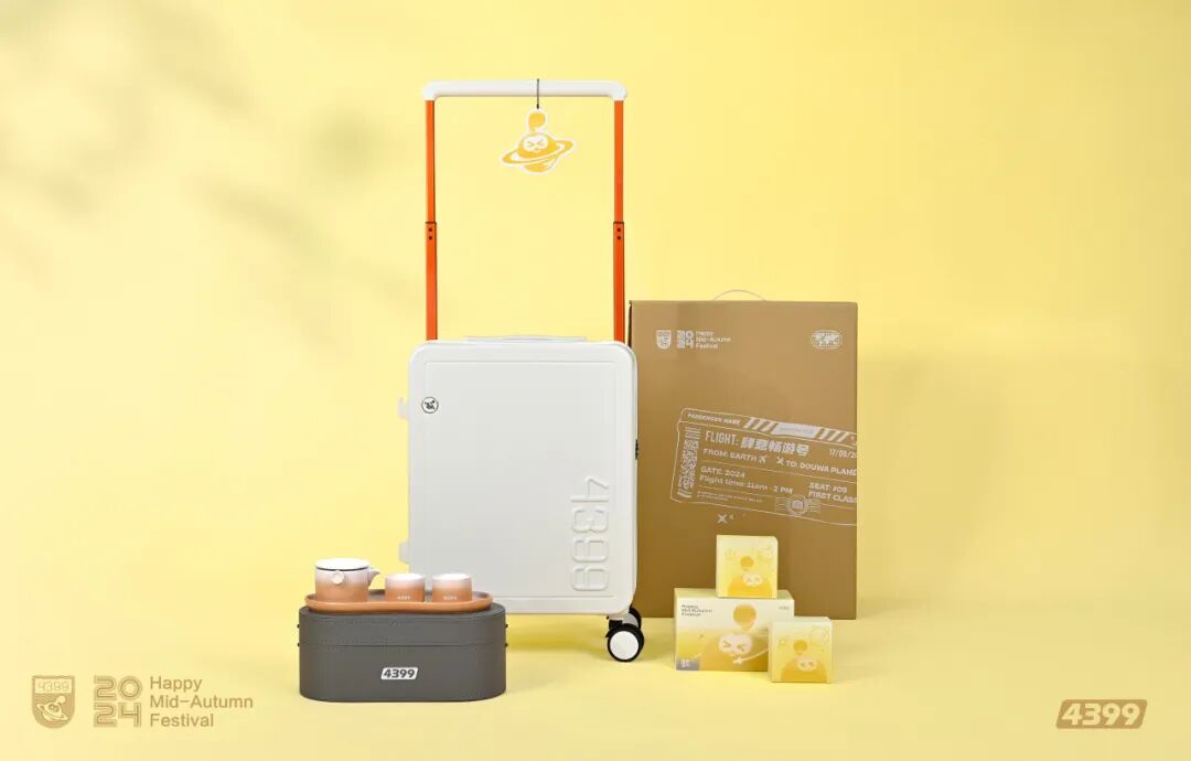 今年中秋节,四三九九为大家准备了以肆意遨游 逐梦同行为主题的中秋礼盒,他们希望,生活在4399宇宙豆娃星球的原住民能够拥有随时启程的勇气,也有短暂停留的底气,都能成为宇宙中独一无二的那颗星。本次礼包内含:定制行李箱*1(两色可选),定制茶具*1(两色可选),广酒月饼*4,贺卡*1。