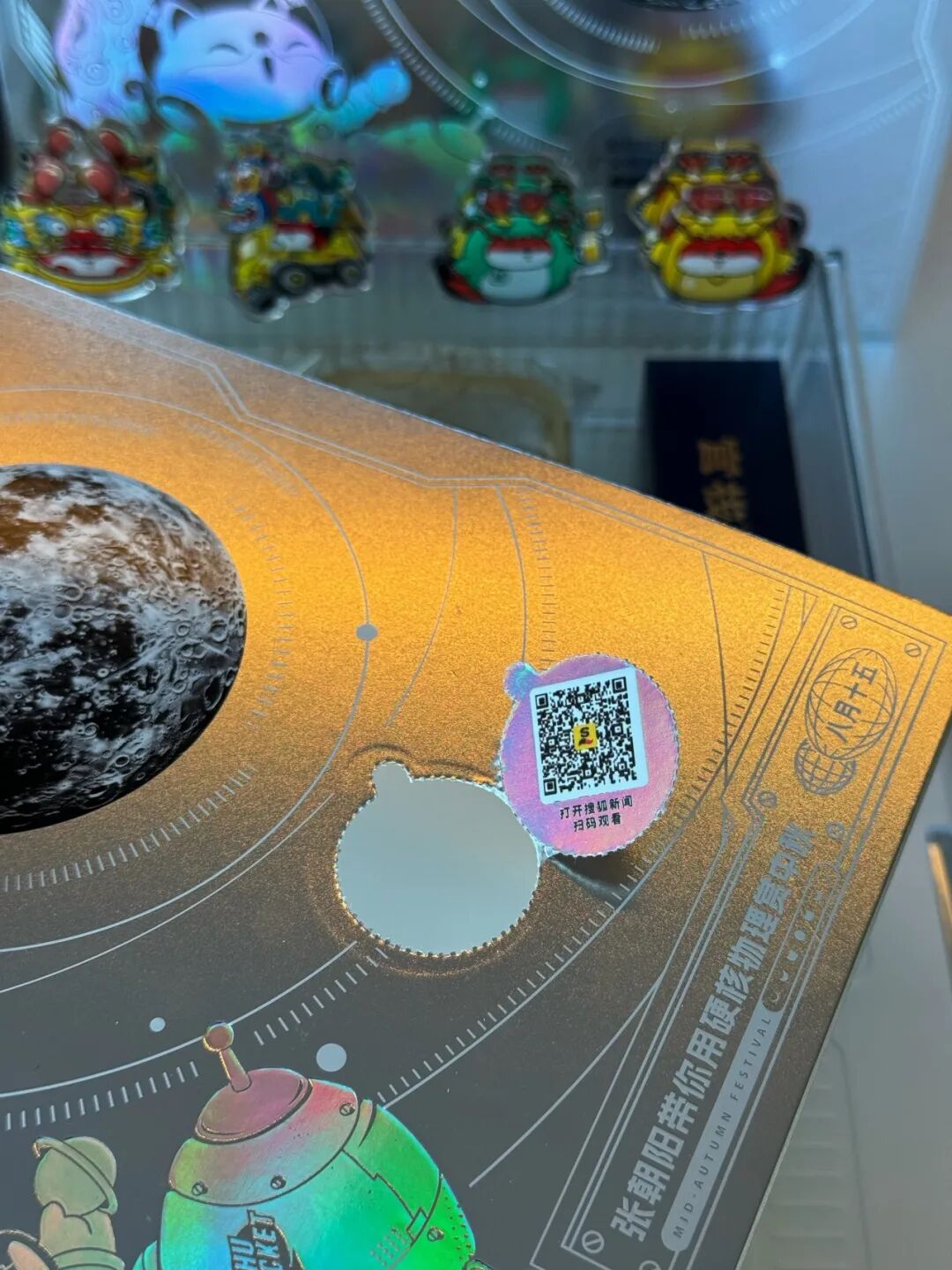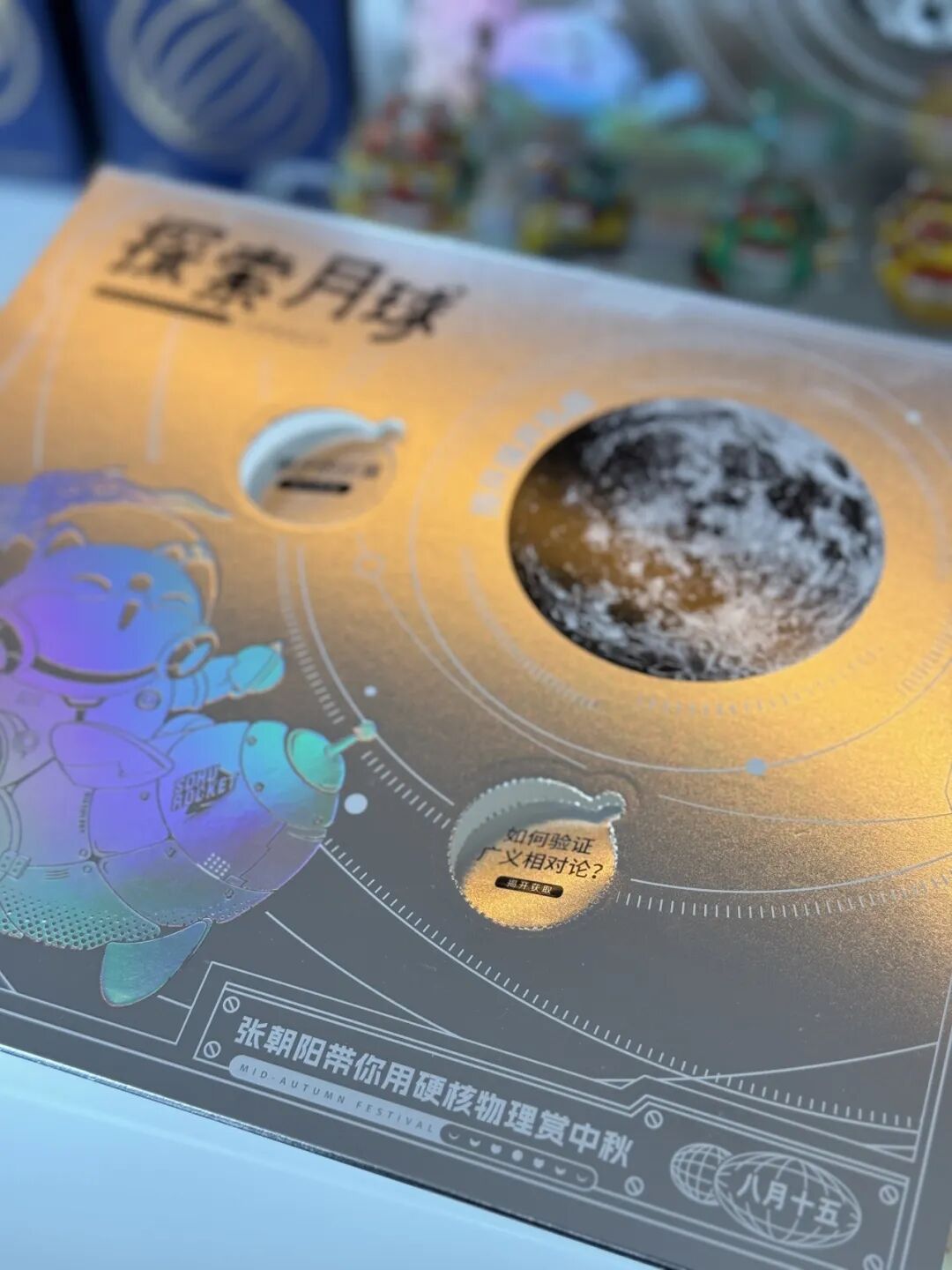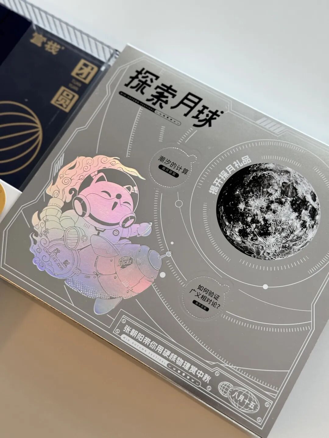 腰封的设计暗藏“玄”机,银色质地仿若感受来自太空的气息,礼盒还有待细心小伙伴发现的可揭开的两处“秘密”知识,背面印有二维码,扫码即可进入《张朝阳的物理课》《张朝阳的英语课》,在享受月圆的同时,更能学习到月圆背后的原理。
