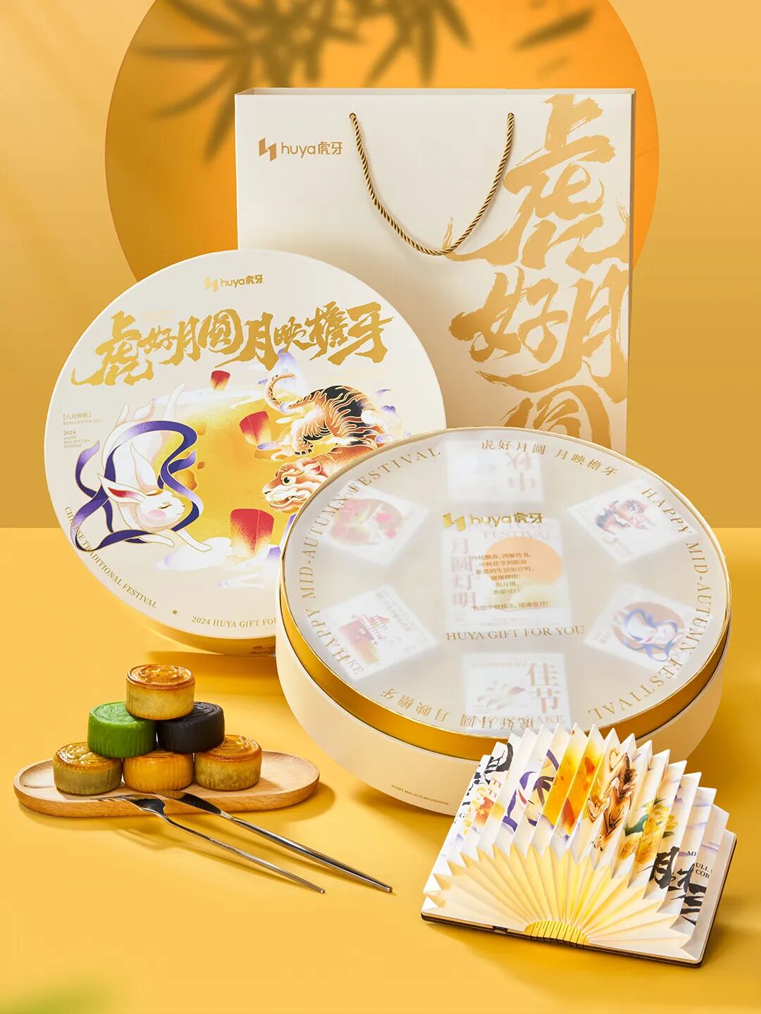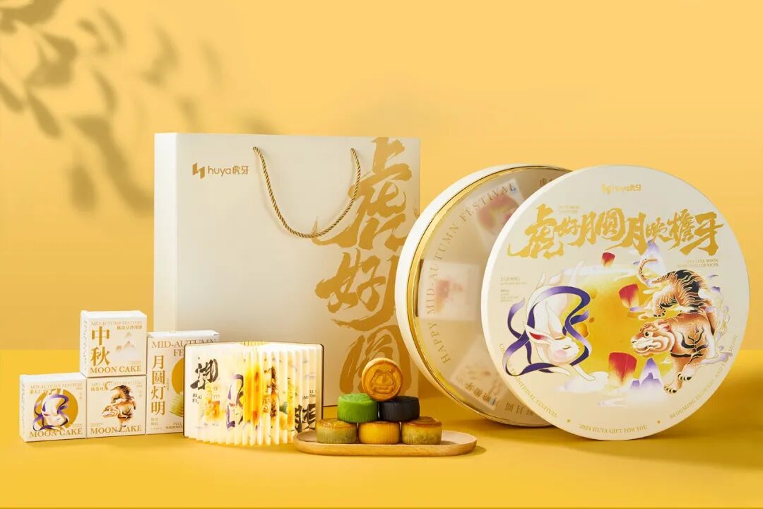 虎牙今年的中秋礼盒以“虎好月圆 月映檐牙”为主题,礼盒包装选用了简洁的圆形造型,以形似一轮满月,传递关于“团圆美满”的真挚祝福。其画面设计灵感源自玉兔与金虎两大东方瑞兽;在典雅的国风笔触之下,“皓月明灯相辉映,玉兔金虎跃碧霄”的美景跃然纸上,意趣盎然。