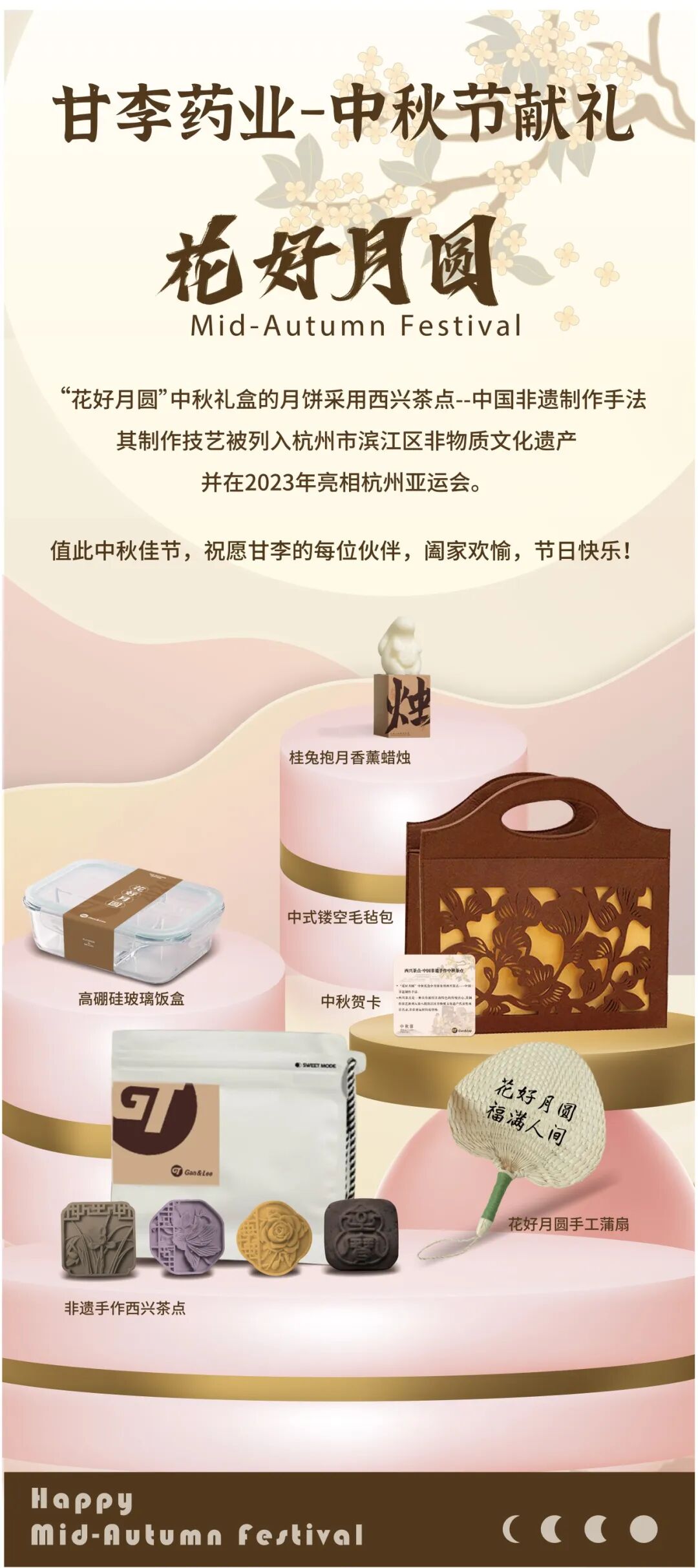 今年中秋节,甘李药业中秋礼盒以“花好月圆”为主题,将中式美学与中秋相结合。礼盒内不仅有精致的中式镂空毛毡包,月饼更是采用非遗手作西兴茶点,除此之外,礼盒内还有桂兔抱月香薰蜡烛、花好月圆手工蒲扇、高硼硅玻璃饭盒,主打一个好看又实用。