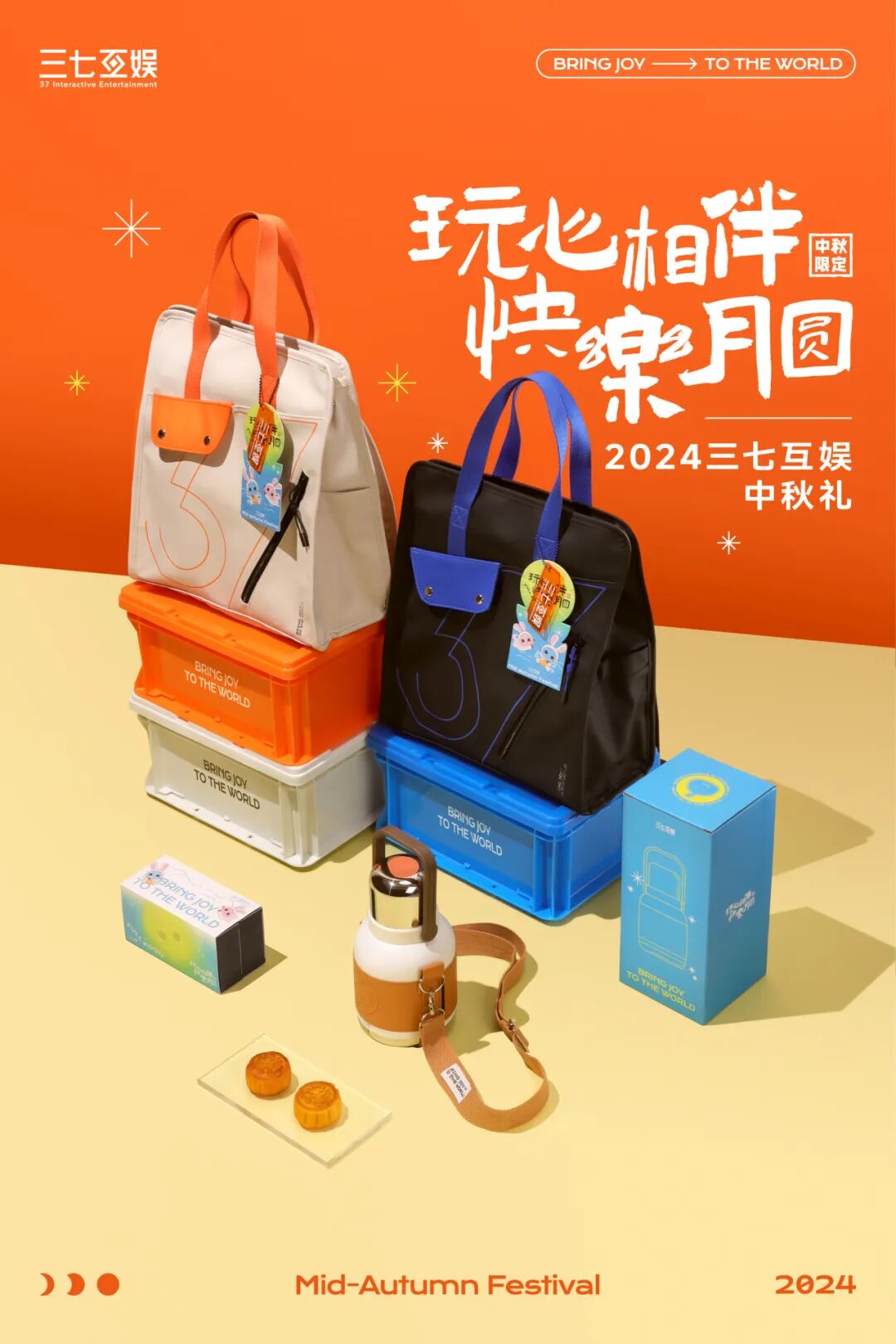 包实用、包丰富、包走心!中秋佳节,三七互娱员工版中秋礼盒以“玩心相伴 快乐月圆”为主题。礼盒内含:37限定双肩包(米白色/黑色)*1、37限定保温壶*1、官栈花胶流心月饼*4、背包挂饰*1。