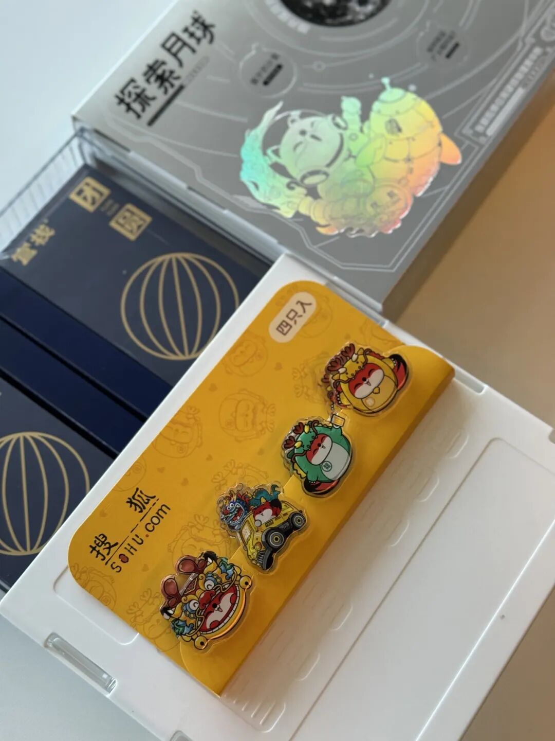 礼盒的设计包含月饼、桌下收纳抽屉盒和搜狐专属小狐狸周边PP夹: