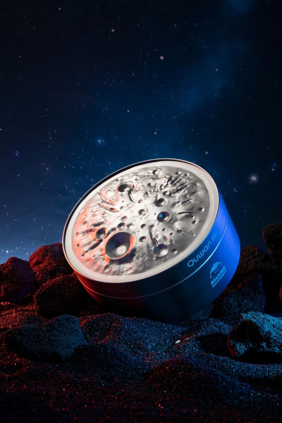 今年的礼盒采用品牌蓝色和科技感银色,从视觉上传达品牌文化及企业探索人工智能科技的决心。礼盒包装为银色马口铁包装盒,用写实的方式去还原月球表面肌理,仿佛能触摸到月球的尘埃,感受那份遥远而神秘的真实,仪式感满满。