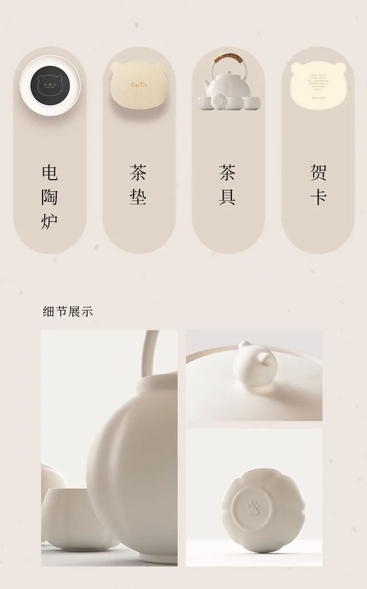 围炉闲话唠家常,温酒煮茶享惬意。围炉套装包含电陶炉、茶垫、茶具,加上小度熊的装饰更显精致,这个中秋让度熊茶具伴家人度过。