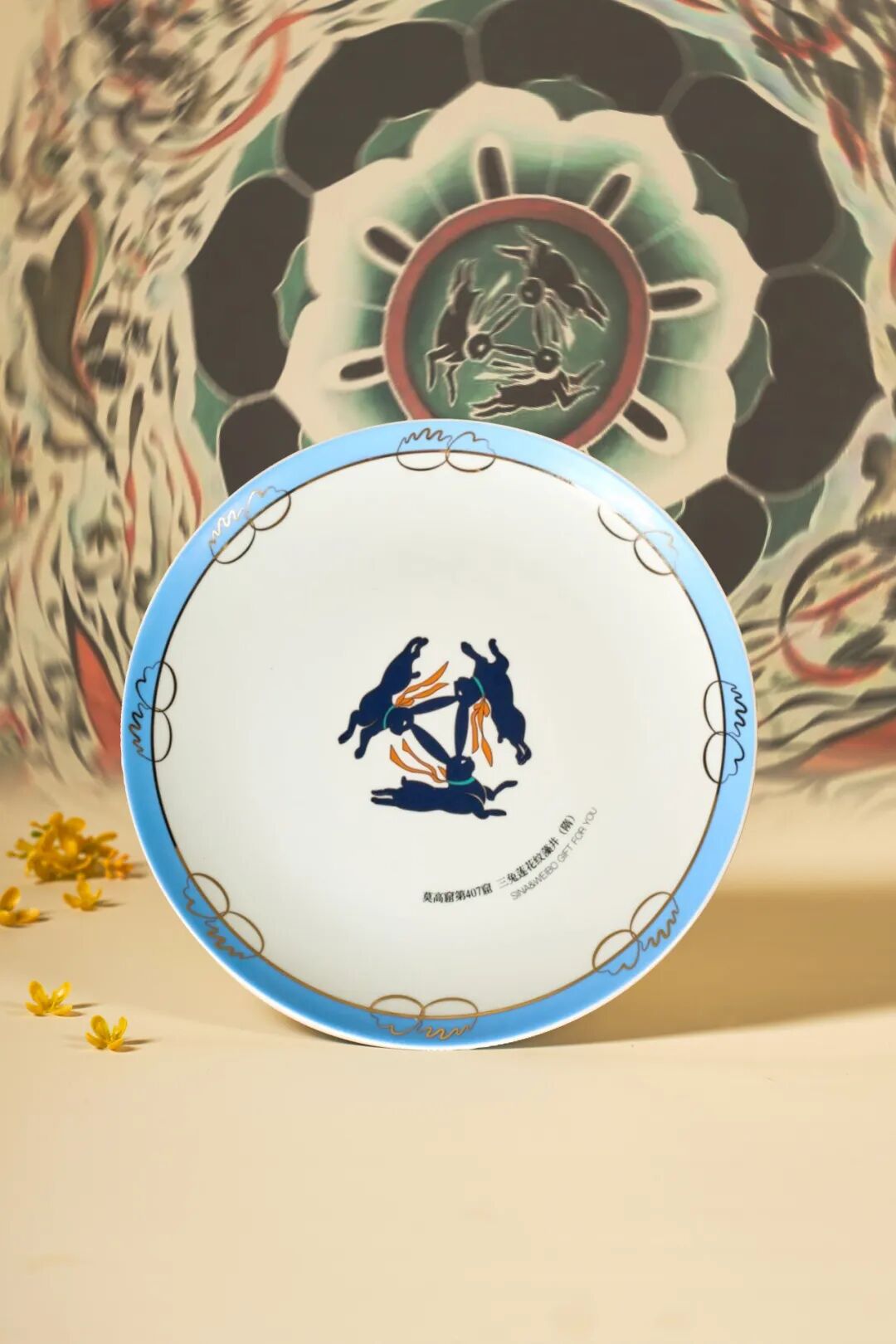 礼盒中,最特别的无疑要数这只 新浪x微博x@莫高窟 联合定制瓷盘,兔子形象取自莫高窟第407窟三兔莲花纹藻井,文化属性拉满。三只兔子两两共用一耳,首尾相接,它们向着同一个方向奔跑的样子,寓意吉祥圆满、生生不息。(据统计莫高窟中出现“三兔共耳”图案的洞窟达22个,第407窟的三兔莲花纹藻井,可谓其中的杰出代表。)