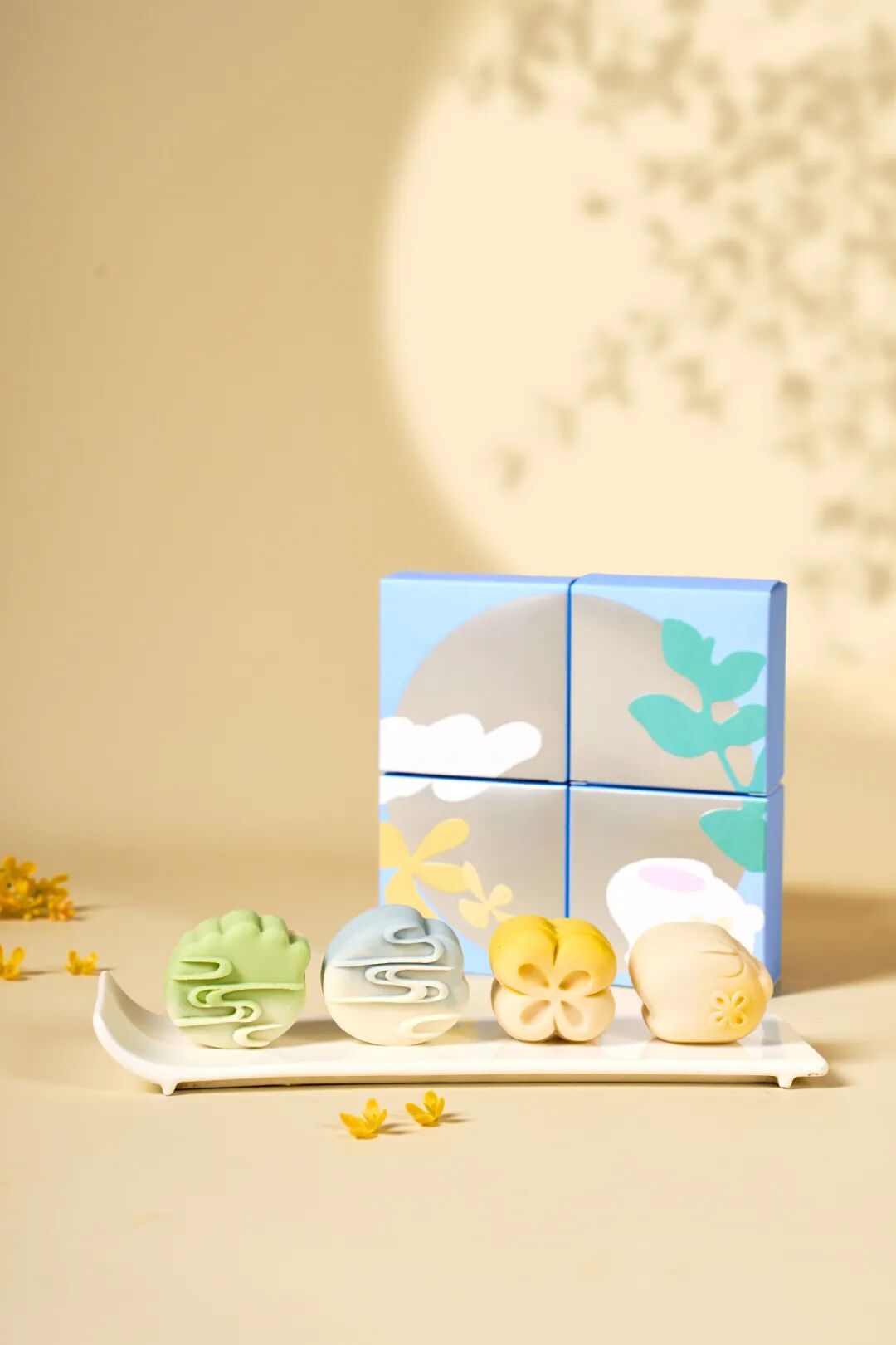 造型别致的一组玉兔月饼则非常体贴地选择了低糖处理,4种口味老少咸宜,口味与健康完美平衡。