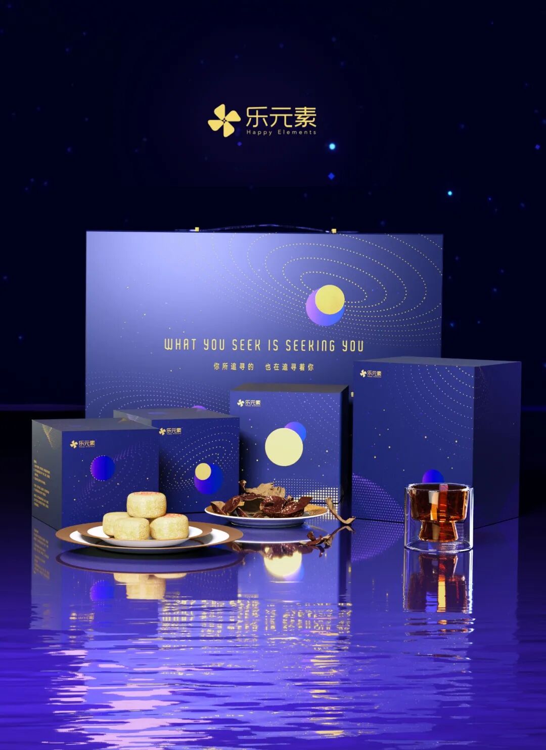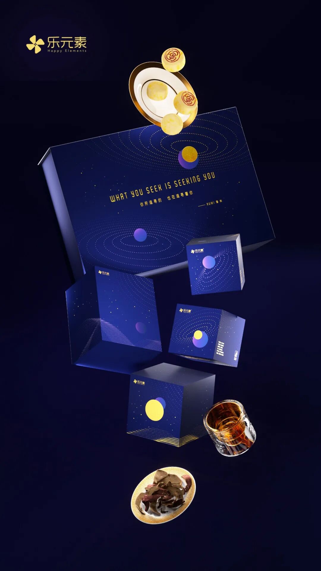当中秋遇上15周年,乐元素以波斯诗人鲁米的诗句“What you seek is seeking you”为灵感设计了周年纪念中秋礼盒。