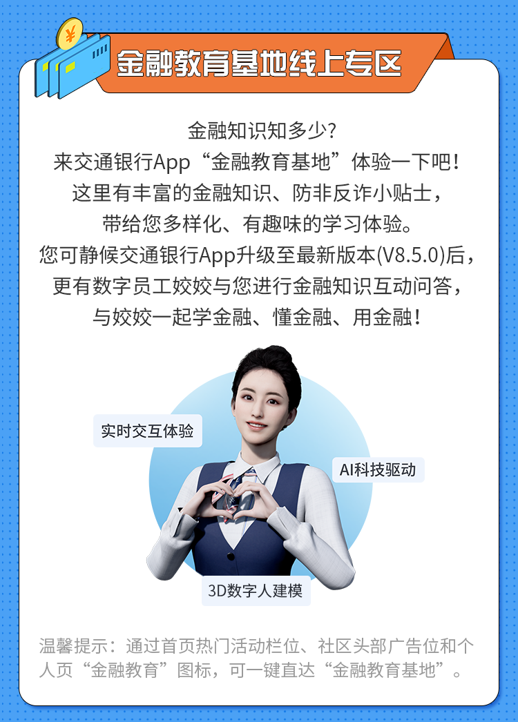 文章内容来源于公众号:交通银行微银行,点此可查看原文,内容版权归相关企业所有,本网站仅供交流学习。若涉及版权问题或存在侵权情况,请及时与我们联系,我们将第一时间进行删除处理。