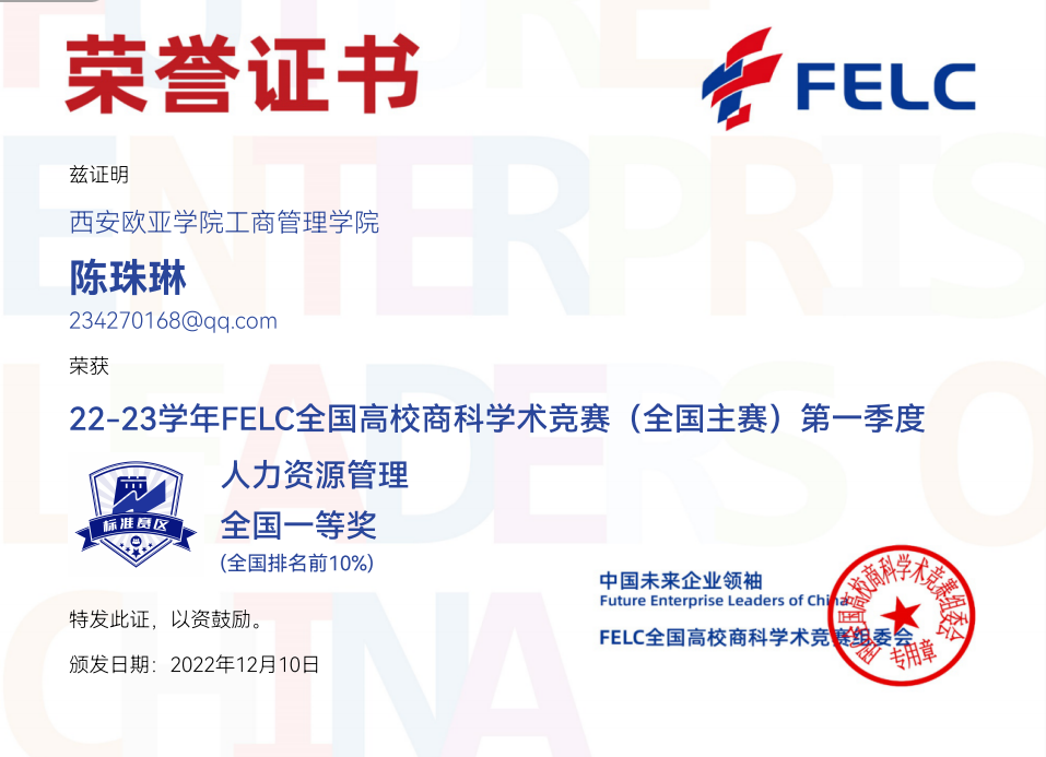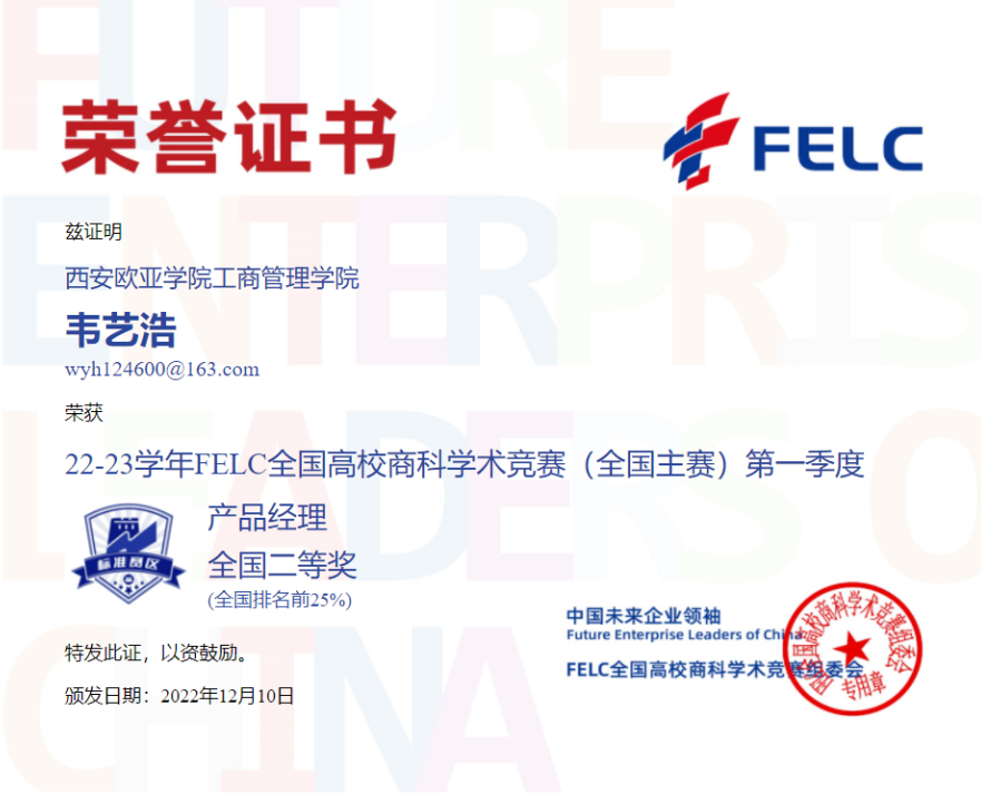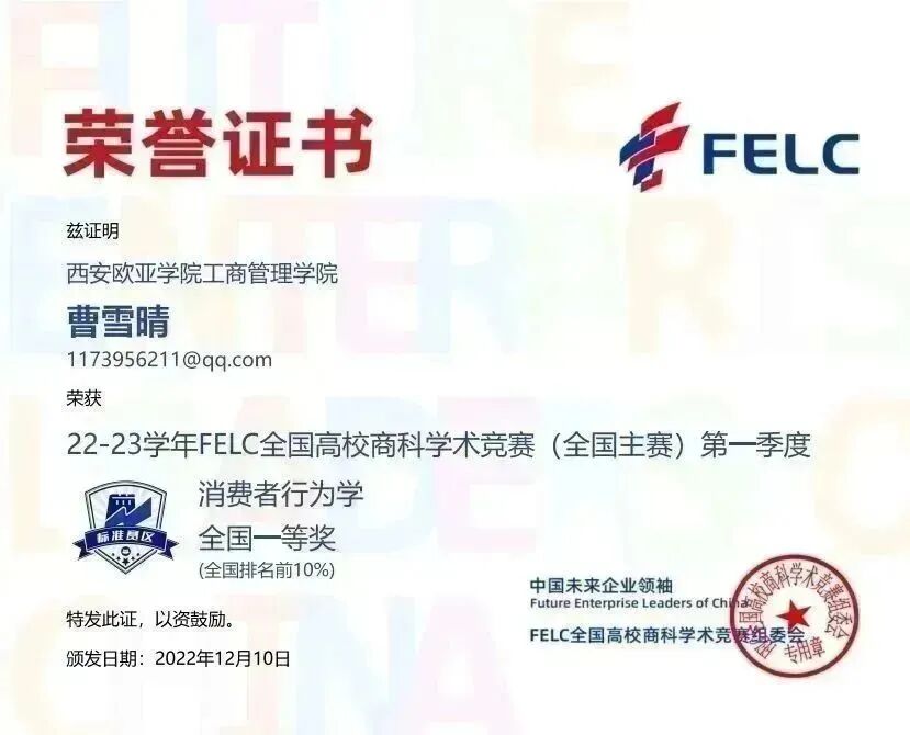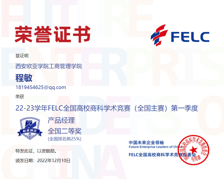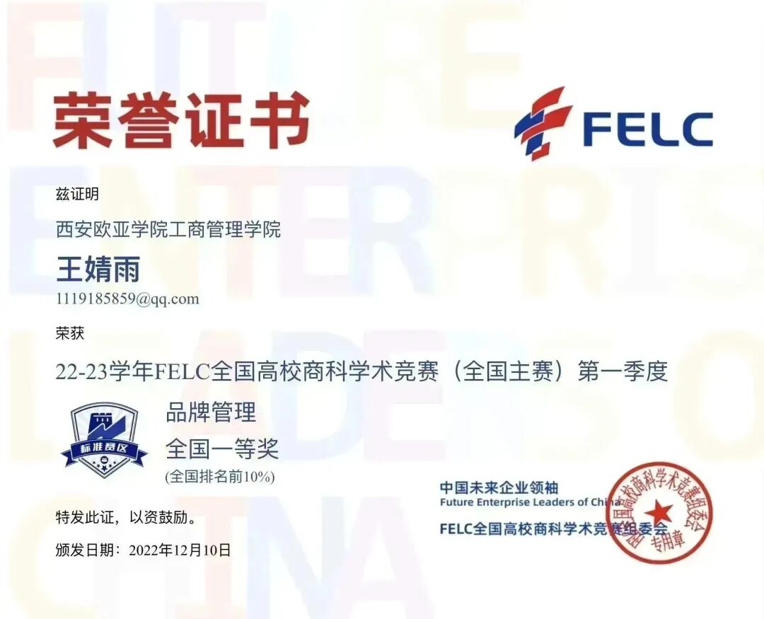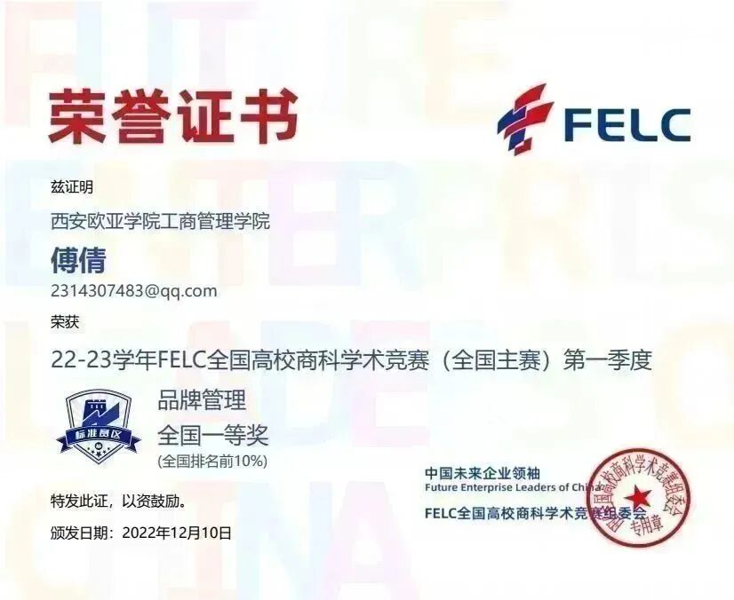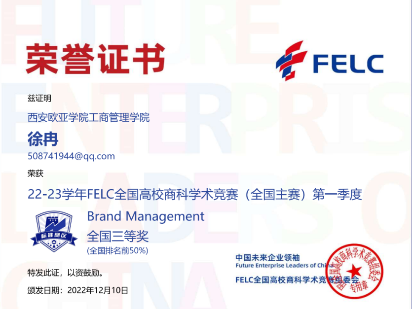 首次参赛,我院学生参赛热情不减,涉及的参赛科目广、获奖种类多。参与并获奖的竞赛科目有:消费者行为学、产品经理、职业沟通、品牌管理、风险管理与保险、人力资源管理、商业银行学、文案写作、Consumer Behavior、Brand Management及Human Resource Management,优异的赛事成绩获得FELC全国高校商科学术竞组委会的官方认可。