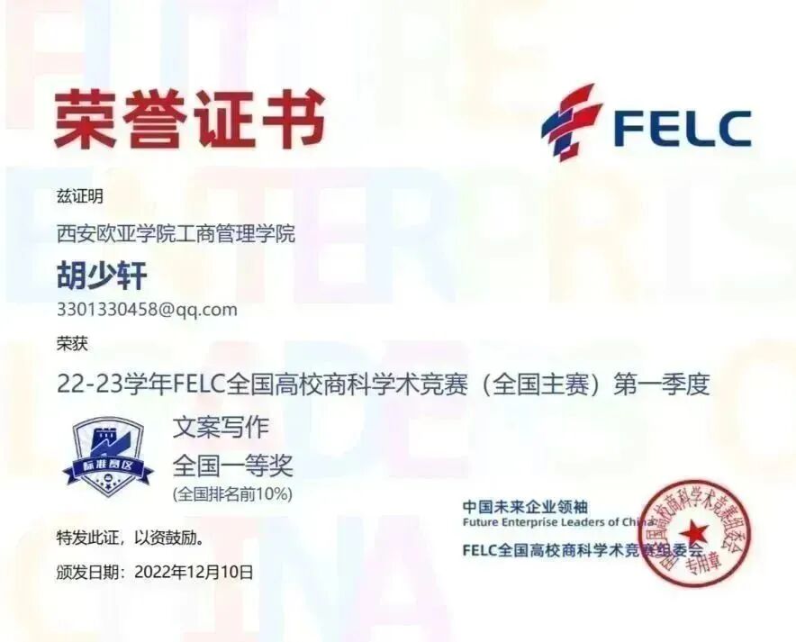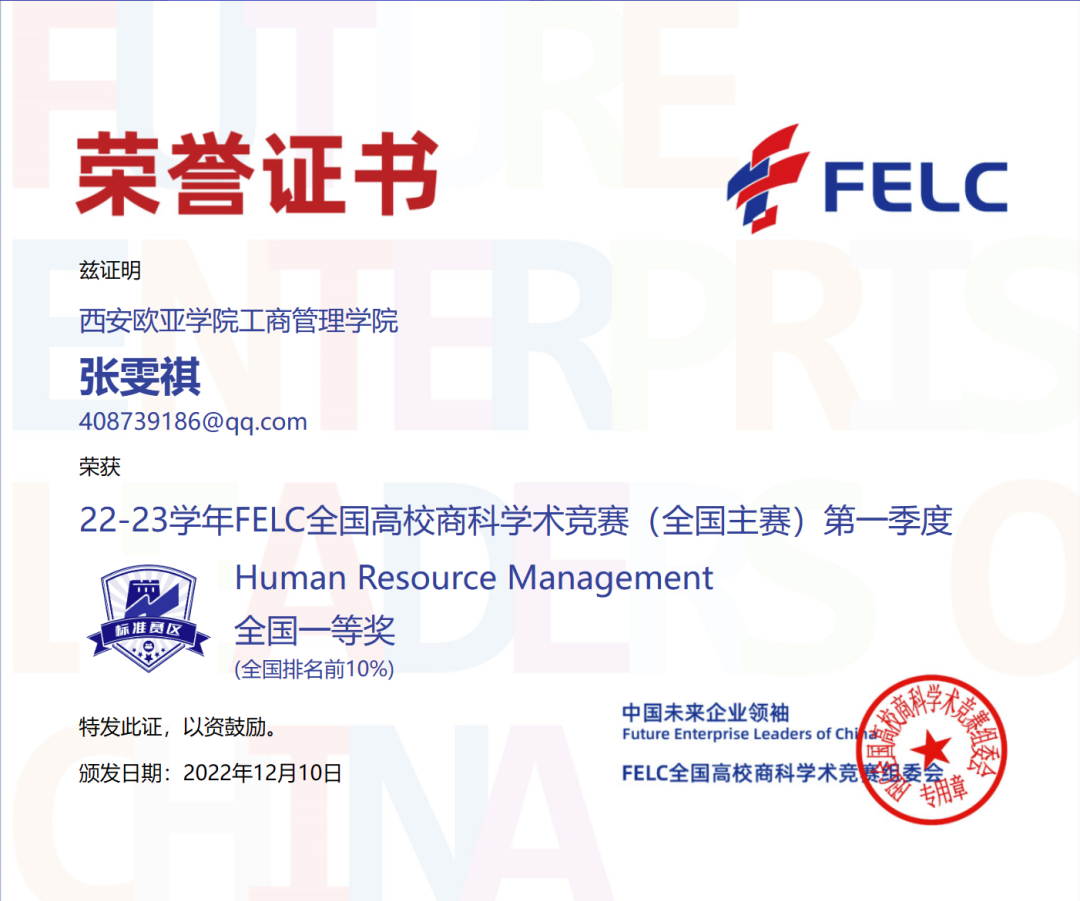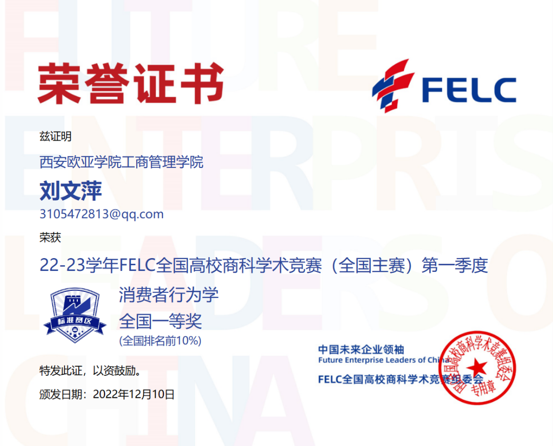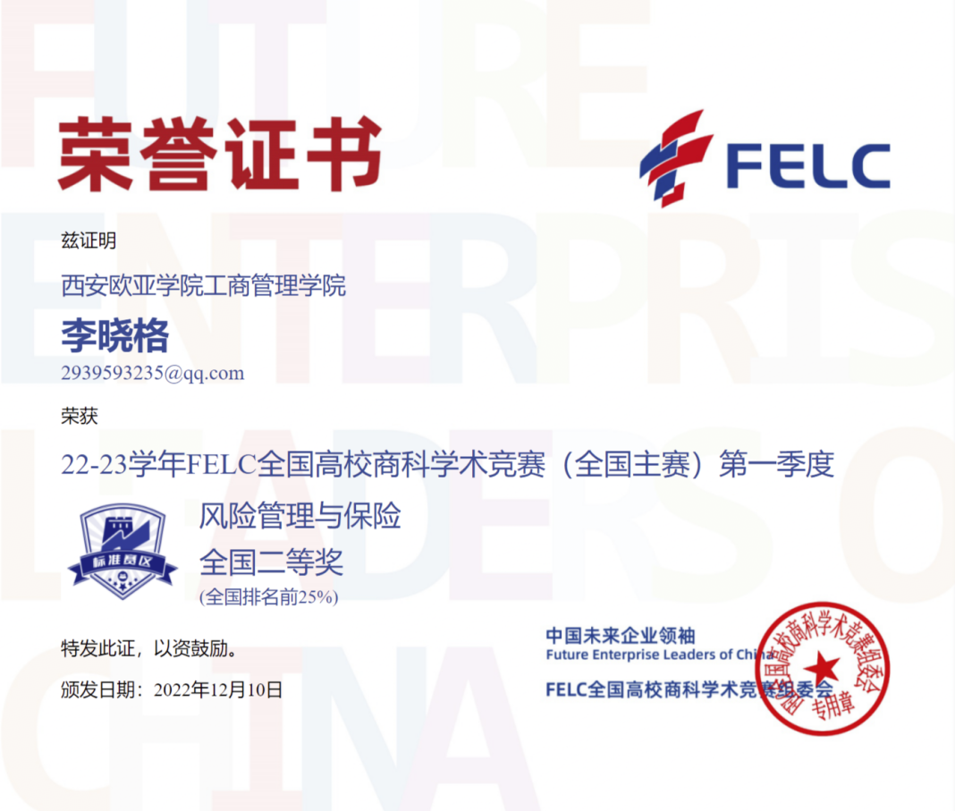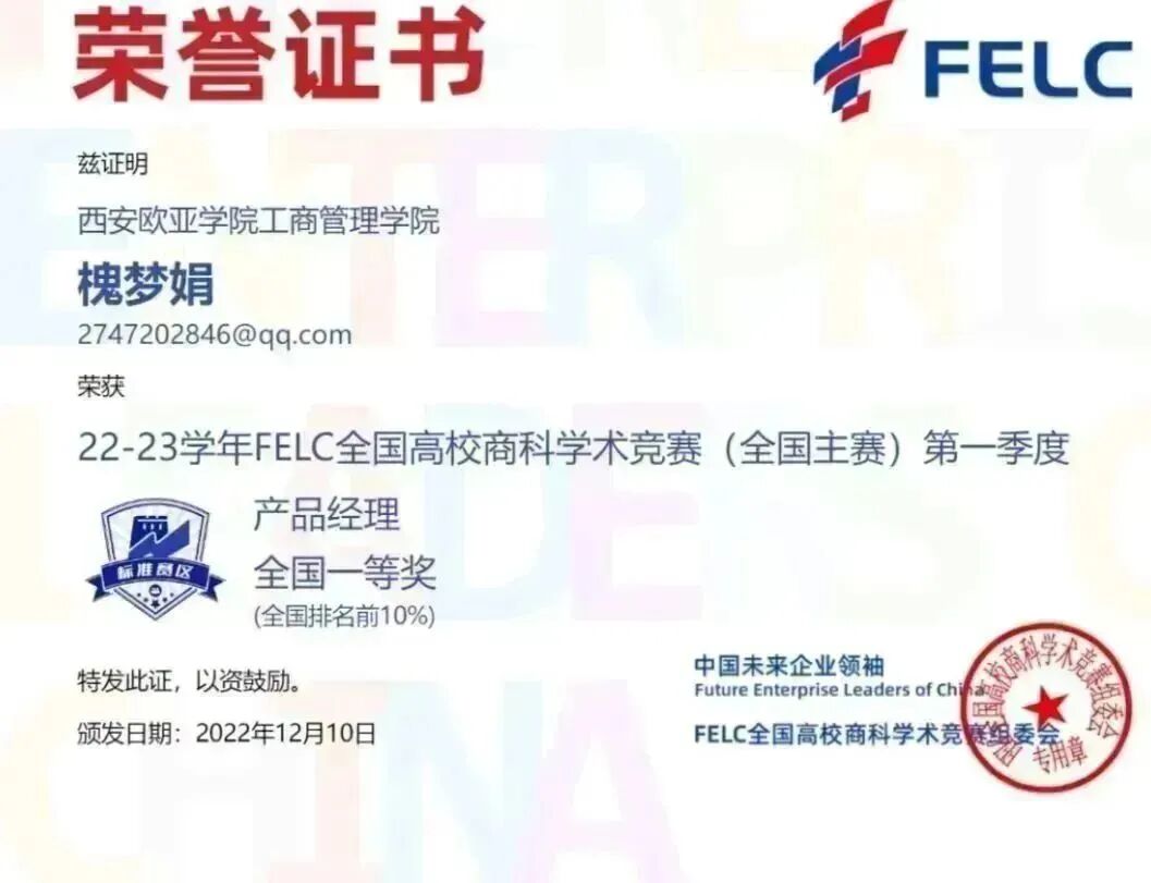 首次参赛,我院学生参赛热情不减,涉及的参赛科目广、获奖种类多。参与并获奖的竞赛科目有:消费者行为学、产品经理、职业沟通、品牌管理、风险管理与保险、人力资源管理、商业银行学、文案写作、Consumer Behavior、Brand Management及Human Resource Management,优异的赛事成绩获得FELC全国高校商科学术竞组委会的官方认可。