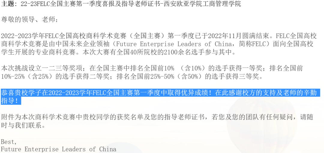 2022-2023学年FELC全国高校商科学术竞赛(全国主赛)第一季度已于2022年11月圆满结束。全国40所院校的2100余名选手参与其中,我院学生共参与考试达445人次,涉及中英文共11门科目。最终斩获全国一等奖53项、全国二等奖98项、全国三等奖124项,教师获优秀指导教师奖8项,初次参赛,首战告捷,满载而归!