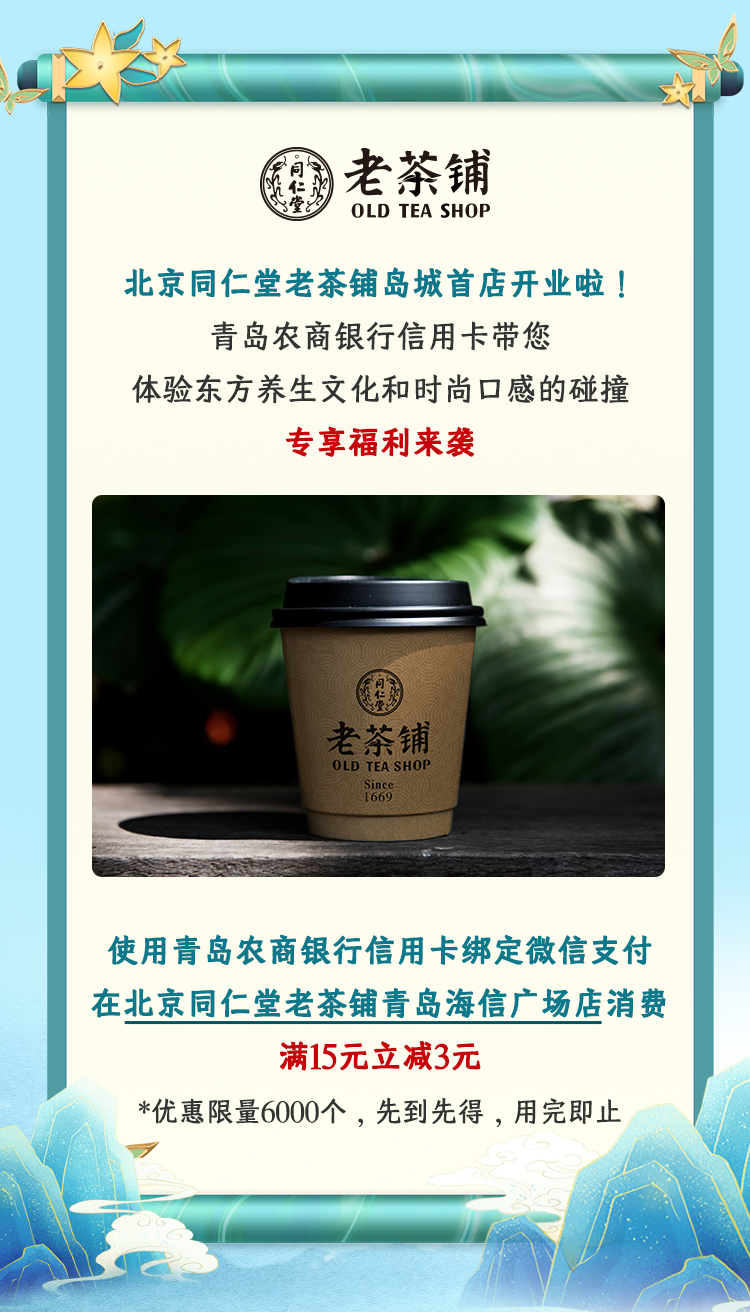 活动期间,使用青岛农商银行信用卡绑定微信支付在北京同仁堂老茶铺青岛海信广场店消费,满15元立减3元。优惠名额共6000个,先到先得,用完即止。每张信用卡每日可参与1次活动。