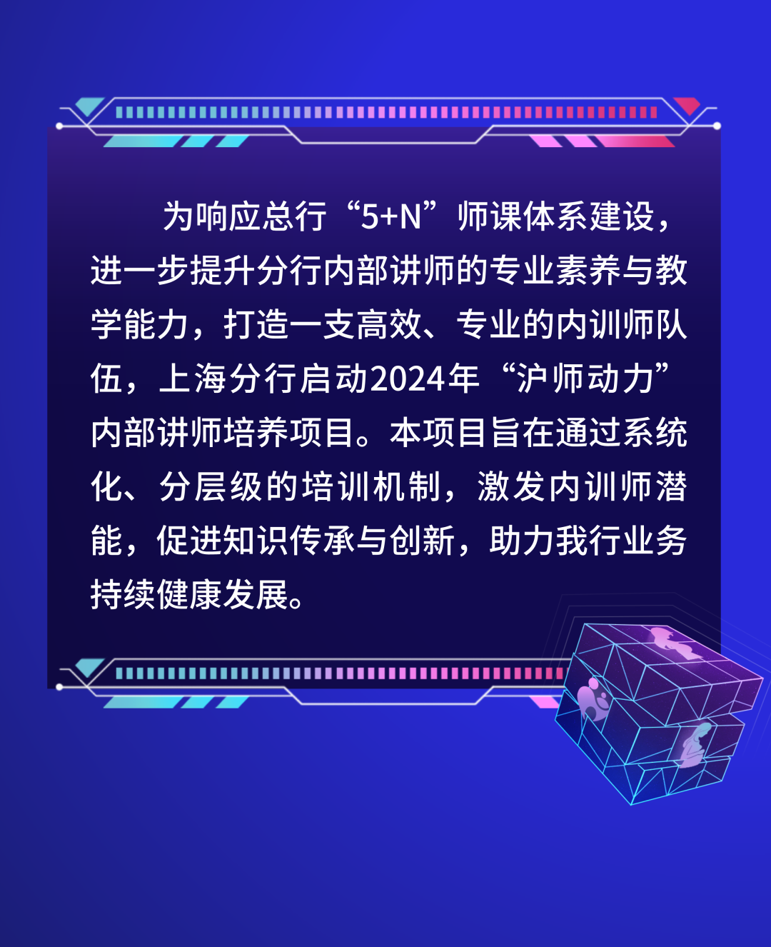 8月15日-8月17日,分行开展赛前线下赋能培训工作坊,特邀外部资深专家针对内训师课程开发及授课演绎进行授课指导。工作坊围绕课程开发痛点,深度剖析优质课程的关键构成与内训师自我角色定位。通过设置若干教学场景,让学员带入其中,在不断地探讨和演练中,引导大家积极交流,思维碰撞,激发智慧火花。在外部讲师的辅导反馈下,学员们对课程内容进行精心打磨和优化,萃取宝贵的案例经验,以确保课程内容的实用性和教学设计的丰富性。