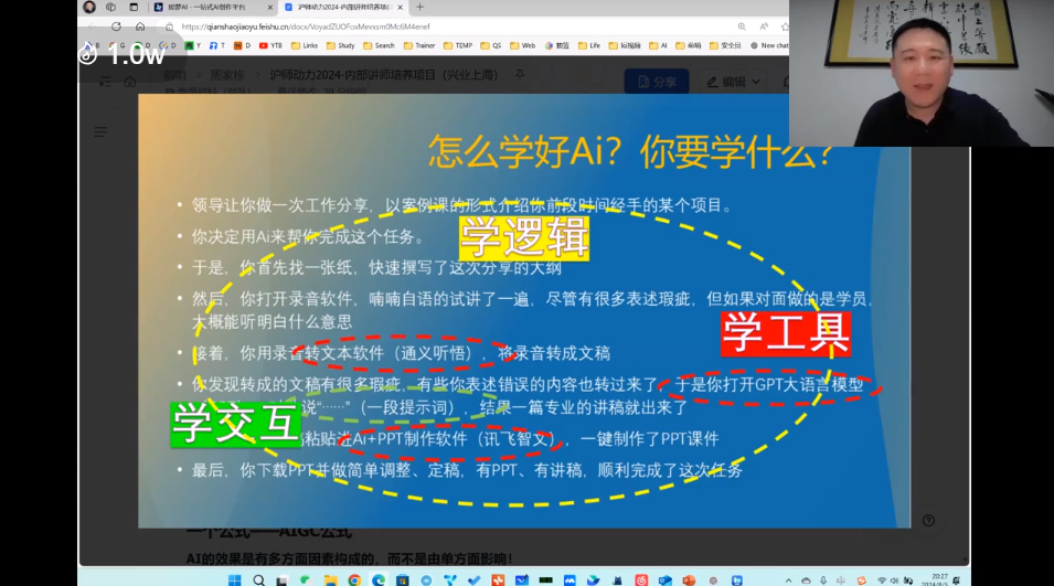 本次项目通过线上全覆盖培养与线下精准工作坊相结合的方式进行。线上阶段于8月初拉开学习序幕,全程以夯实内训师基础知识,赋能AI技术,助力内训师工作效率提升为目的。一百多位内训师通过在线学习平台进行直播课程学习,学工具、学逻辑、学交互,掌握于AI对话的基础公式,让AI成为内训师的私教。