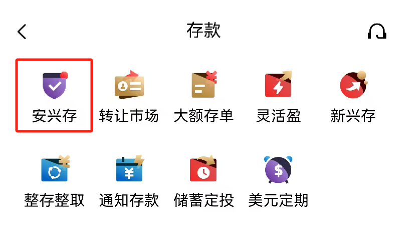 在手机银行首页找到“存款”按钮,点击跳转至“存款”页面后,再次点击“安兴存”按钮,即可跳转至“安兴存”产品页面;