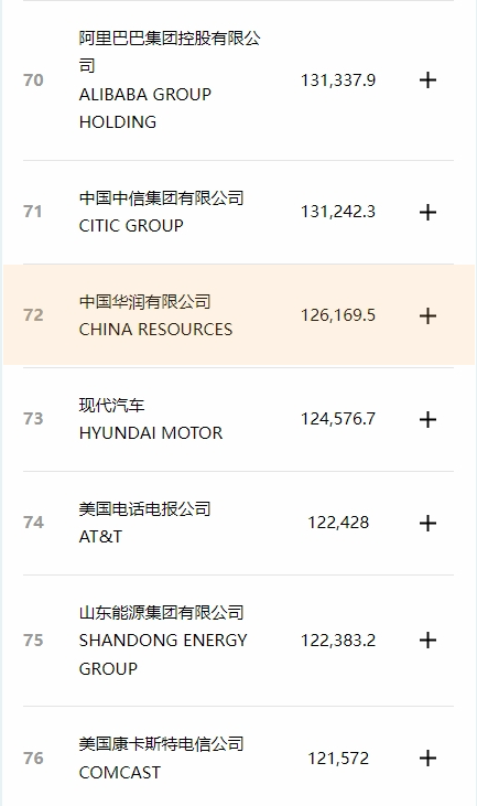 华润集团排名第72位