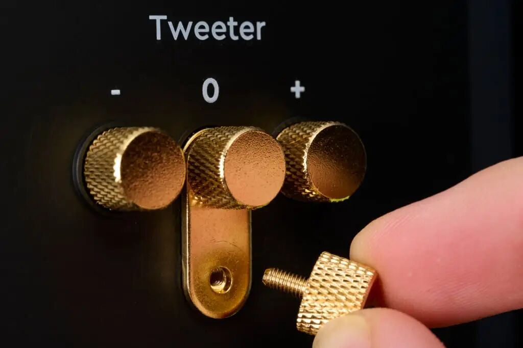 高音单元的声音调节器设置在极板端子的上方。通过使用镀金金属桥板,您可以将高音范围提升或降低1.5分贝。