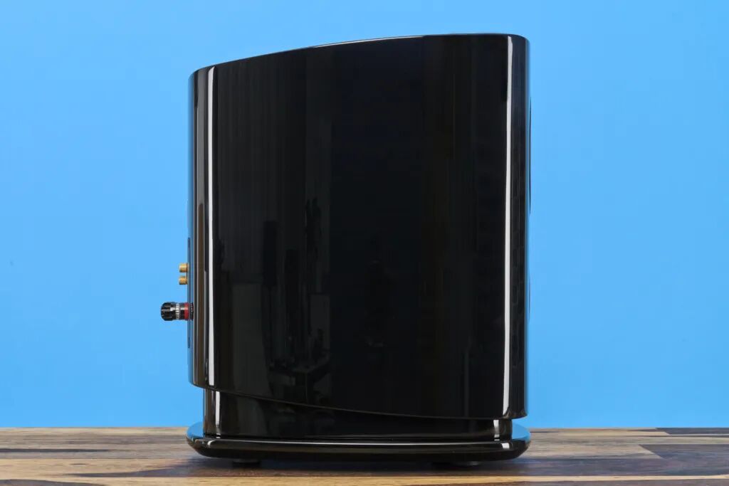 在扬声器与底座之间的间隙中,巧妙地安置了一个低音反射管。位于后部WBT端子正上方的小型接触桥,负责对音频进行精细调整。扬声器的后部设计得比前部更为窄,侧板则以优美的曲线从前端流畅延伸至后端。整个外壳设计都在极力避免平行面的出现,防止声音相互抵消。