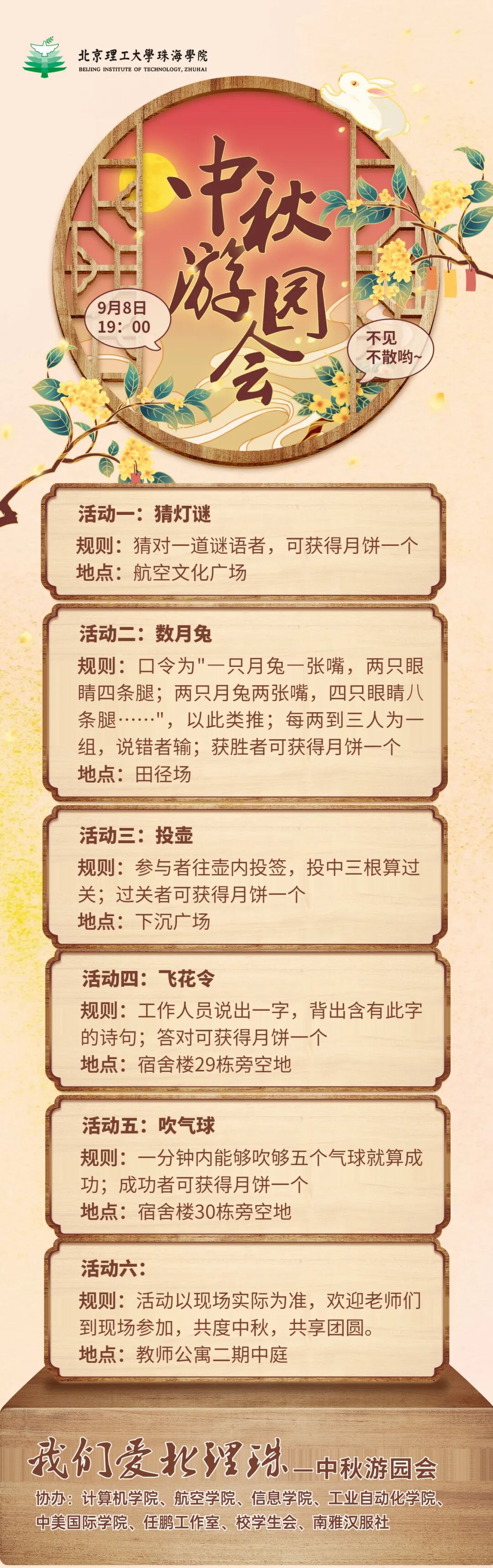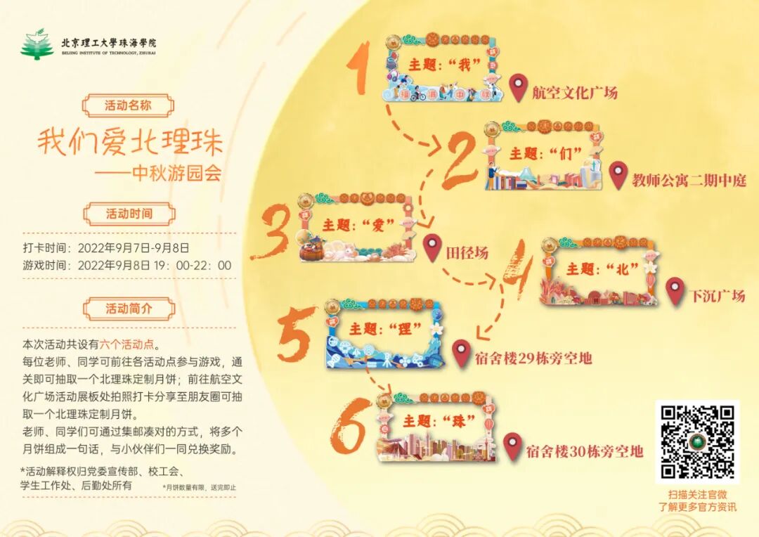 提示:集齐的同学可在游戏时间内前往六个活动点进行兑换,参与兑换的月饼需要保持包装完整,月饼拆封后不再参与奖励活动。