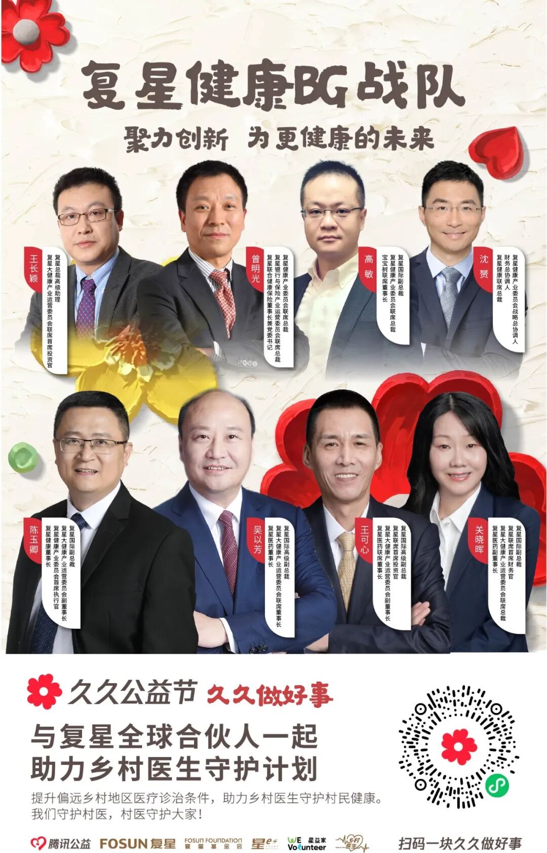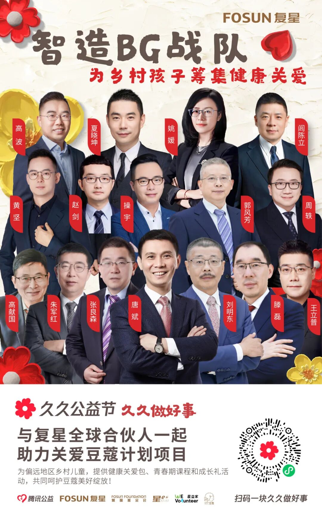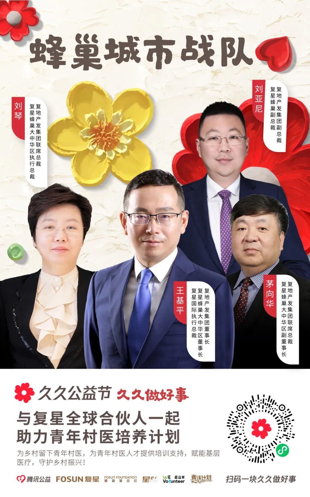 近130位复星全球合伙人,领衔复星一家复星集团本部、大健康、大快乐、大富足、大智造、蜂巢大中华6大战队,为4大公益项目筹款。