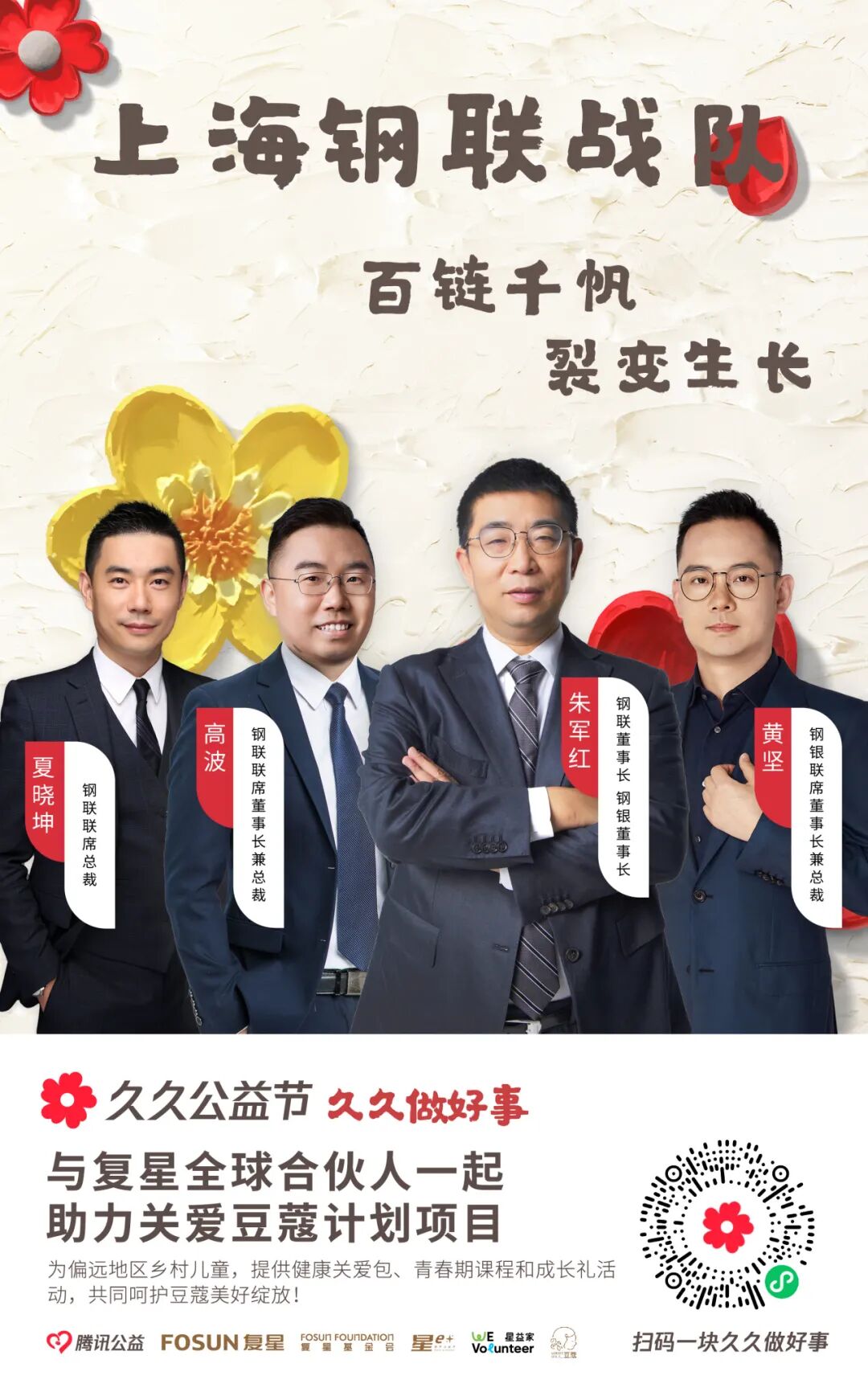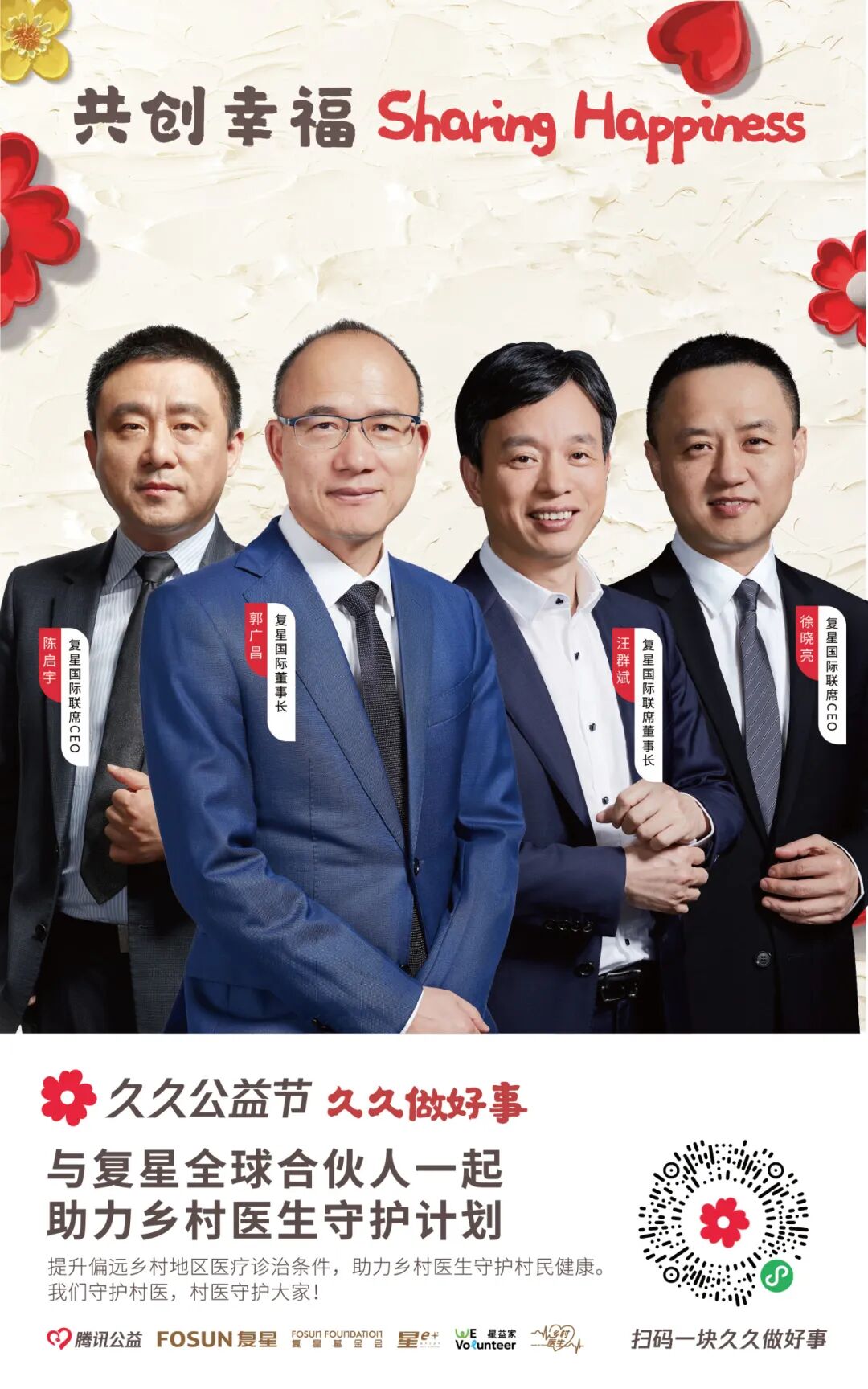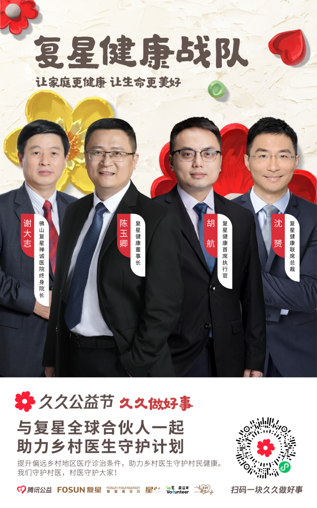 近130位复星全球合伙人,领衔复星一家复星集团本部、大健康、大快乐、大富足、大智造、蜂巢大中华6大战队,为4大公益项目筹款。