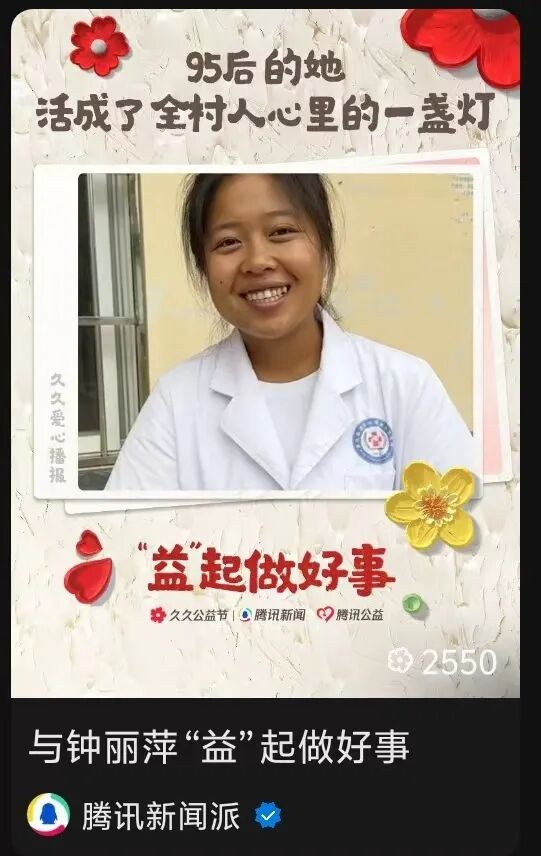 复星基金会、腾讯新闻邀请视频创作达人凡人繁星,拍摄创作以首届暖心村医青年榜样钟丽萍故事为题材的短视频,在腾讯新闻、视频号播放量超过41.4万,1.96万人次点亮小红花,参与“分分赞”,助力公益项目获得配捐;在抖音平台播放量超过236.7万,点赞人次超5.2万,登陆抖音热榜。