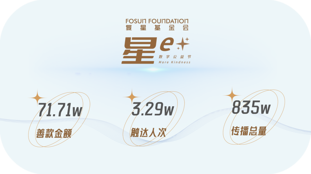 首届"星e+"数字公益节已经告一段落,复星基金会将与公益伙伴一同开启项目执行工作,定期对公众同步项目进展情况。我们将不负支持与信任,秉承“助天下”初心,扎实做好项目,和复星一家一起连接更多善意,把温暖和善意传递给每一位需要帮助的受益人!