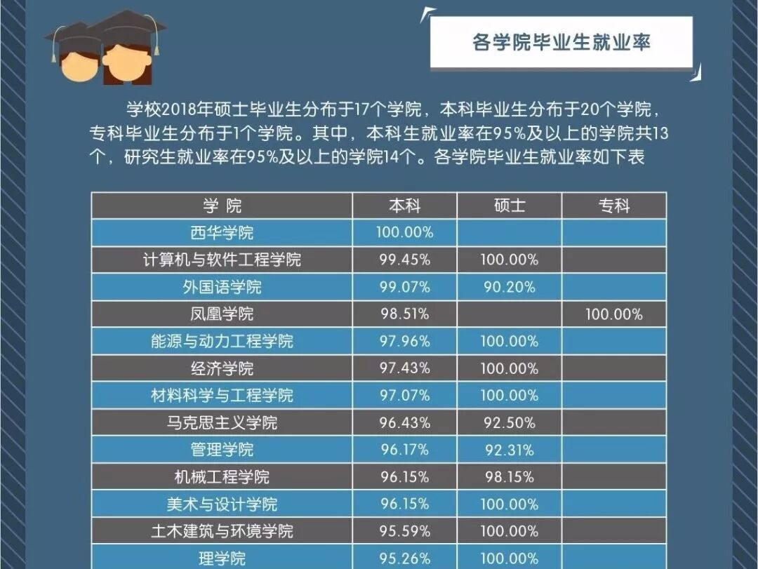 从下面两张统计图可以看出(图源西华大学微信公众号),近两年计算机与软件工程学院就业率均在西华大学名列前茅,且都高于99%。