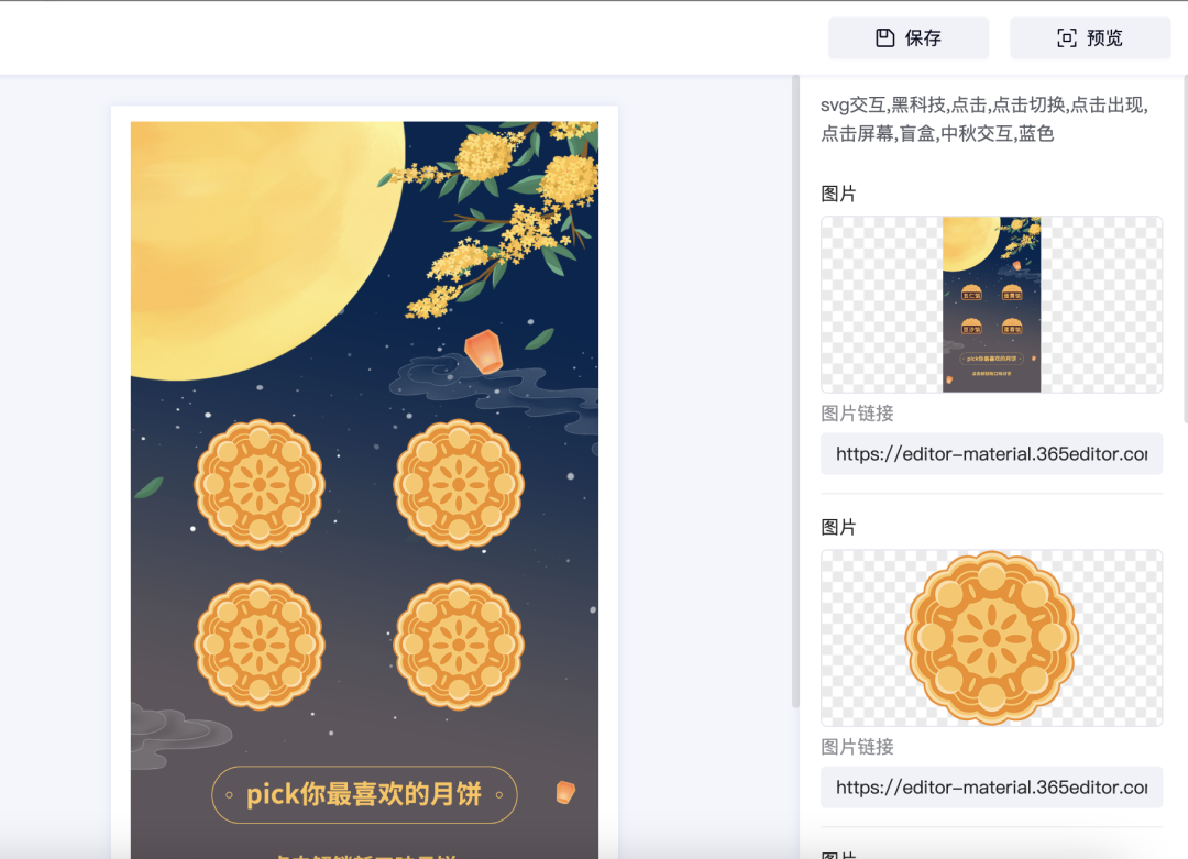 此交互互动感更强一点,与拆盲盒有相似之处,增强娱乐感。每个月饼后都隐藏一种口味月饼,操作并不复杂,如果该交互可以满足需求,则不需要替换,点击直接使用。也可以根据需求,修改点击后图片内容。