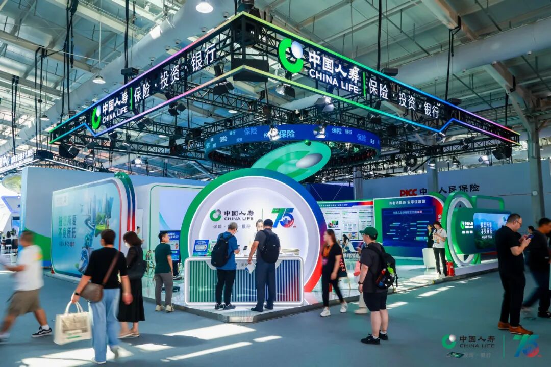 中国人寿展台以代表保险板块的绿色、代表投资板块的蓝色、代表银行板块的红色为主色调,围绕“服务国家发展大局 守护人民美好生活”主题,设置“75周年与国同生,与国共荣”“以高质量金融服务做好五篇大文章”“实干笃行 服务国之大者”“以人民为中心 守护美好生活”等板块,积极展现公司发挥行业头雁作用,汇聚综合金融优势,一体化发展取得的各项成果。