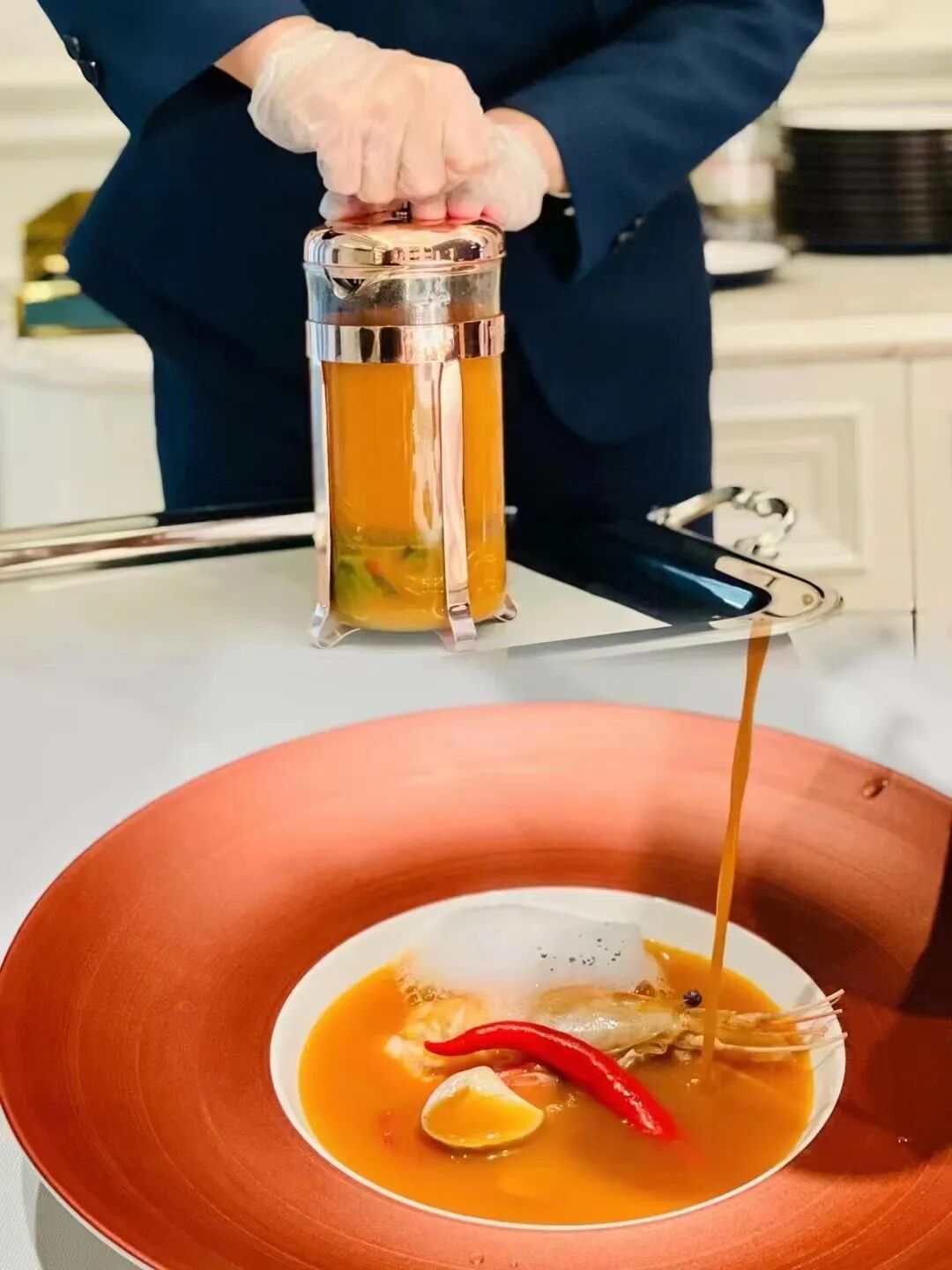 现场使用法压壶萃取壶里的柠檬香茅鲜料味