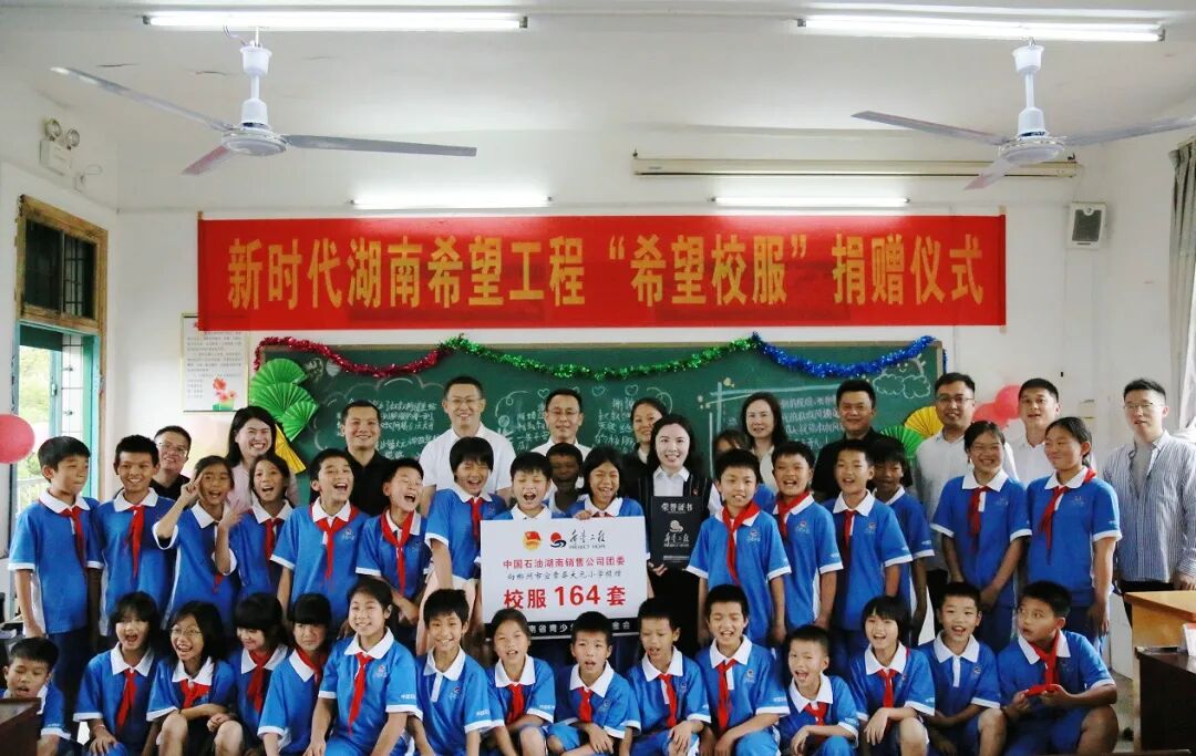 今年6月,在新时代湖南希望工程“希望校服”公益项目募捐活动中,中国石油湖南销售响应“助学兴教”号召,积极组织广大员工大力开展助学兴教工作,为“祖国的花朵”送上更多的温暖和陪伴,并一次性筹集善款1.7万余元,为帮扶的两座希望小学近200名学生配置了首批统一校服,为孩子们送上了一份特别的“六一”礼物。
