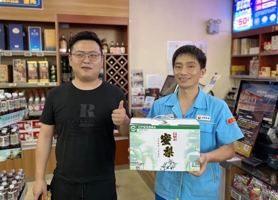 说起“爱心蜜梨”在昆仑好客便利店内售卖这件事,那还要回到2023年。庄行蜜梨是庄行镇潘垫村村民的主要经济收入来源,但由于村子地理位置偏远、道路崎岖,导致蜜梨一度滞销。当得知村民面临这一困境,上海销售沪南分公司主动联系当地村委会,将庄行蜜梨成功引入加油站便利店售卖,让滞销蜜梨有了销售新渠道。