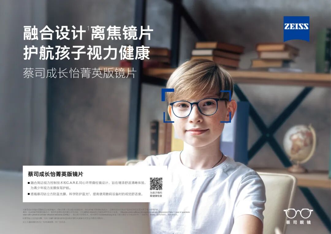 蔡司一直致力于儿童青少年近视防控研究,提供个性化的近视管理方案。蔡司成长怡菁英版镜片,融合了周边离焦技术和C.A.R.E.同心环带微柱镜两项优势防控技术,搭载钻立方防蓝光膜的镜片耐磨耐刮,更能有效防护蓝光与紫外线的威胁,持久护航孩子的视力健康发育。