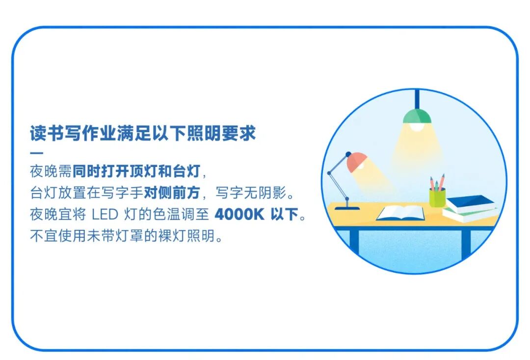孩子用眼看书写字都应在采光良好、照明充足的环境中进行,近距离用眼时,桌面的平均照度值不应低于 300 勒克斯(lux)[8],在光线过暗或过强的环境下看书写字,都会容易引起孩子眩光、视疲劳。