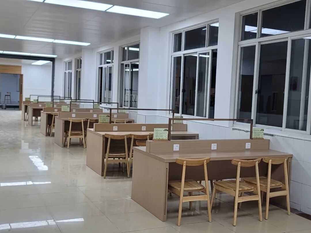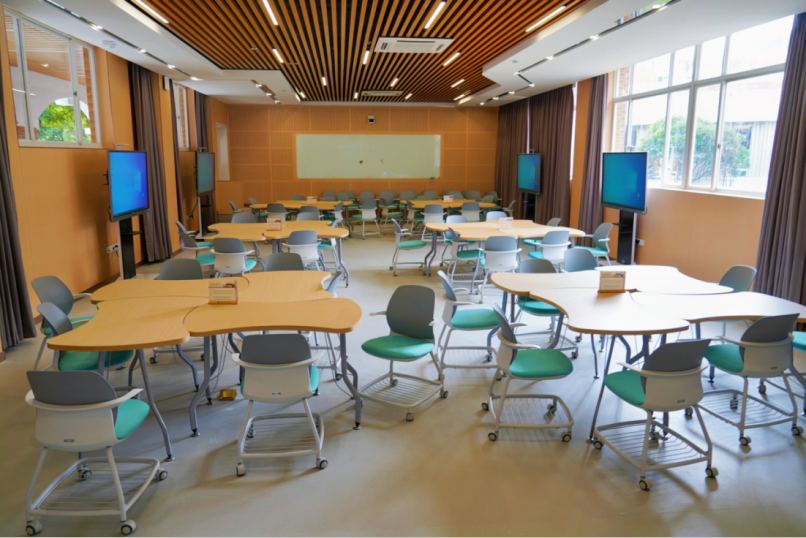 6间智慧平面教室。教室最后一排的“创意座位”,采用高脚凳设计,方便后排同学看清老师板书。