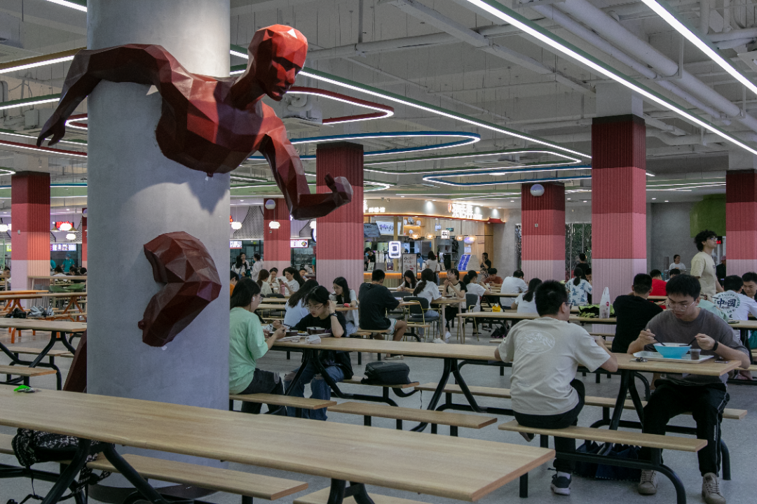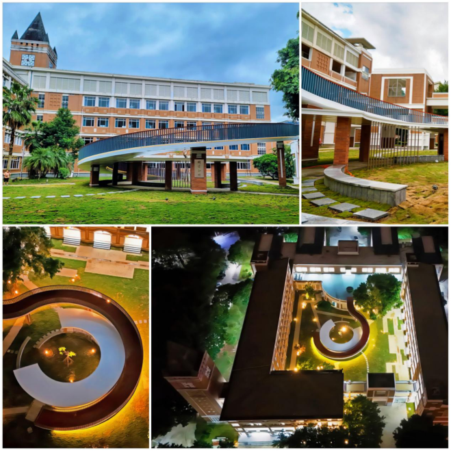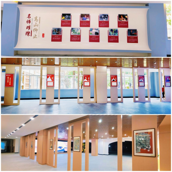 园区打造丰富多彩的文化育人空间。钟楼下的入门大厅建有名师墙、学风校训墙、优秀学生作品墙、教学运行数据墙等;创新建设集合美学和文化氛围的“问道”文化走廊、“知明广场”。