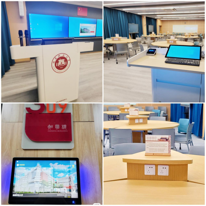 本次知明楼共22间教室进行了升级改造,实现研讨教学、高清录课、直播教学、跨班互动教学、督导场景化评课等功能。