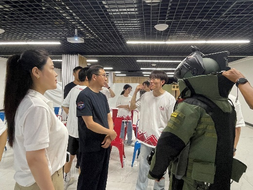 团队成员在北京理工大学重庆创新中心进行学习参观,在北理工重创智能防务中心还原国产完全自主防爆装备研发过程的关键步骤,与重庆市特警排爆大队的一线排爆专家及排爆手进行交流座谈。