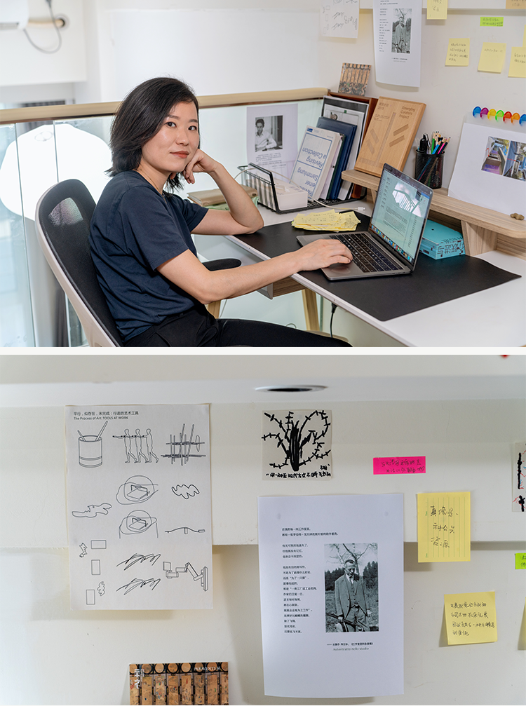 作为策展人,张营营有一种独特的能力,她的所有居住空间都可以成为她的“策展现场”。工作室上下两层loft,被她布置成了一个有生命感的空间:窗台即是图书馆,高墙上是她在上海当代艺术博物馆策划的第一个展览《平行,似存在,未完成:行进的艺术工具》的相关文献。在这里,能窥见她部分的策展思维。