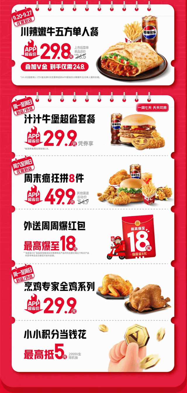 4、仅适用于肯德基超级APP手机自助点餐和肯德基超级APP宅急送订餐。用户使用肯德基超级APP最新版本才能参与活动。