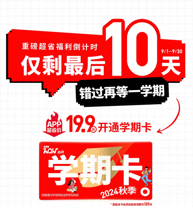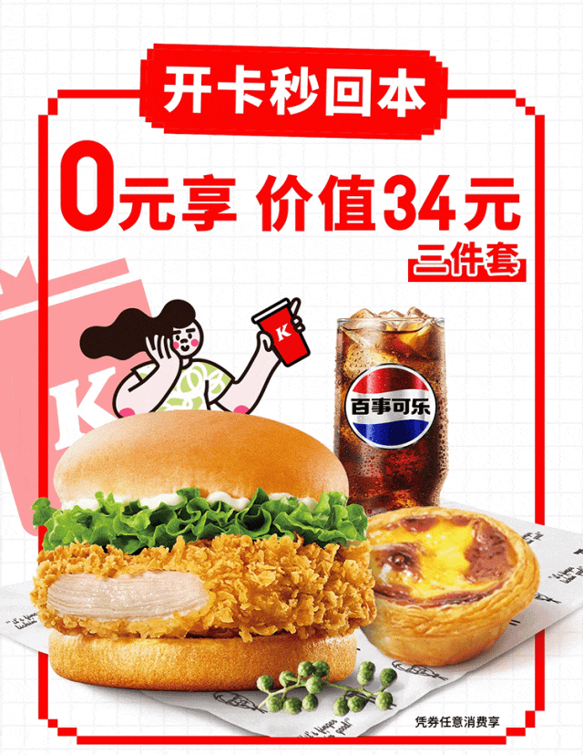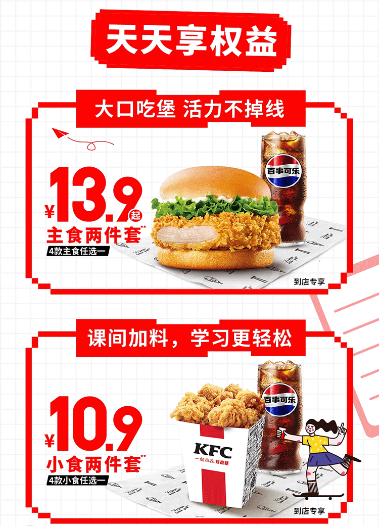 *指本卡会员权益有效期为120天;▼指活动期间开卡可得APP专享0元享学生超值套餐1份(任意消费享)优惠券1张。套餐中产品菜单单品总价34元,超过购买肯德基2024秋季学期卡(120天)的金额。优惠券使用有效期及使用规则详见“我的卡包”券说明。***具体以肯德基超级APP/微信/支付宝内活动页面公示为准。◆6:00-9:29时段,单笔订单点购产品满19元可享;9:30-次日5:59时段,单笔订单点购产品满29元可享。每天限享2次,使用该权益的同时可享受免打包服务费。◆◆大学生专享,活动期间每人限参与1次。