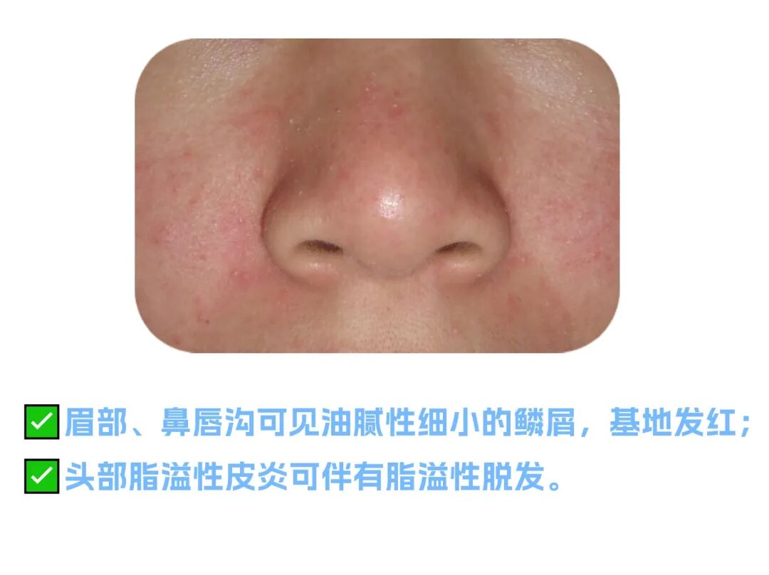 红斑、瘙痒、油腻的鳞屑或痂皮。