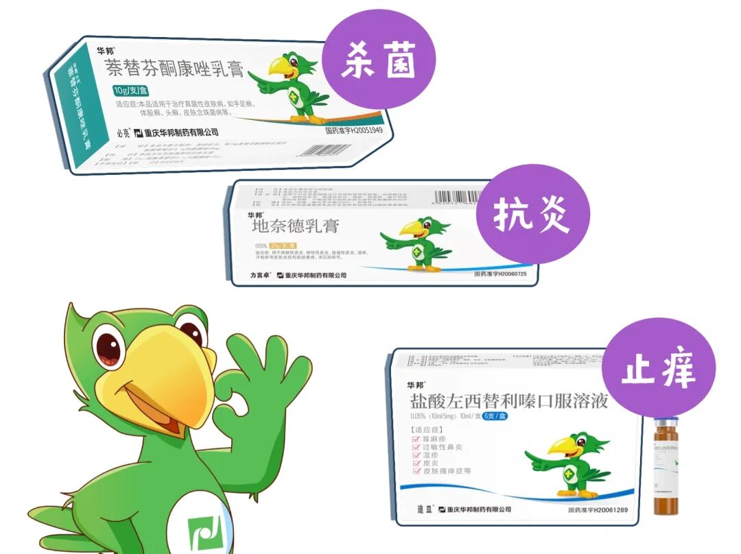 2、外用抗真菌药物杀灭真菌(华邦®必亮®萘替芬酮康唑乳膏等)、再联合外用弱效激素(华邦®力言卓®地奈德乳膏等)抗炎。