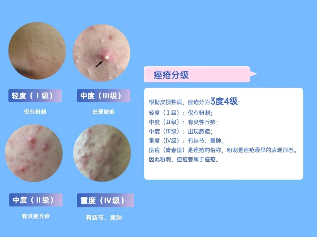 痤疮的治疗需要与当下痤疮的皮损情况进行选择。痤疮根据皮损性质,分为3度4级。