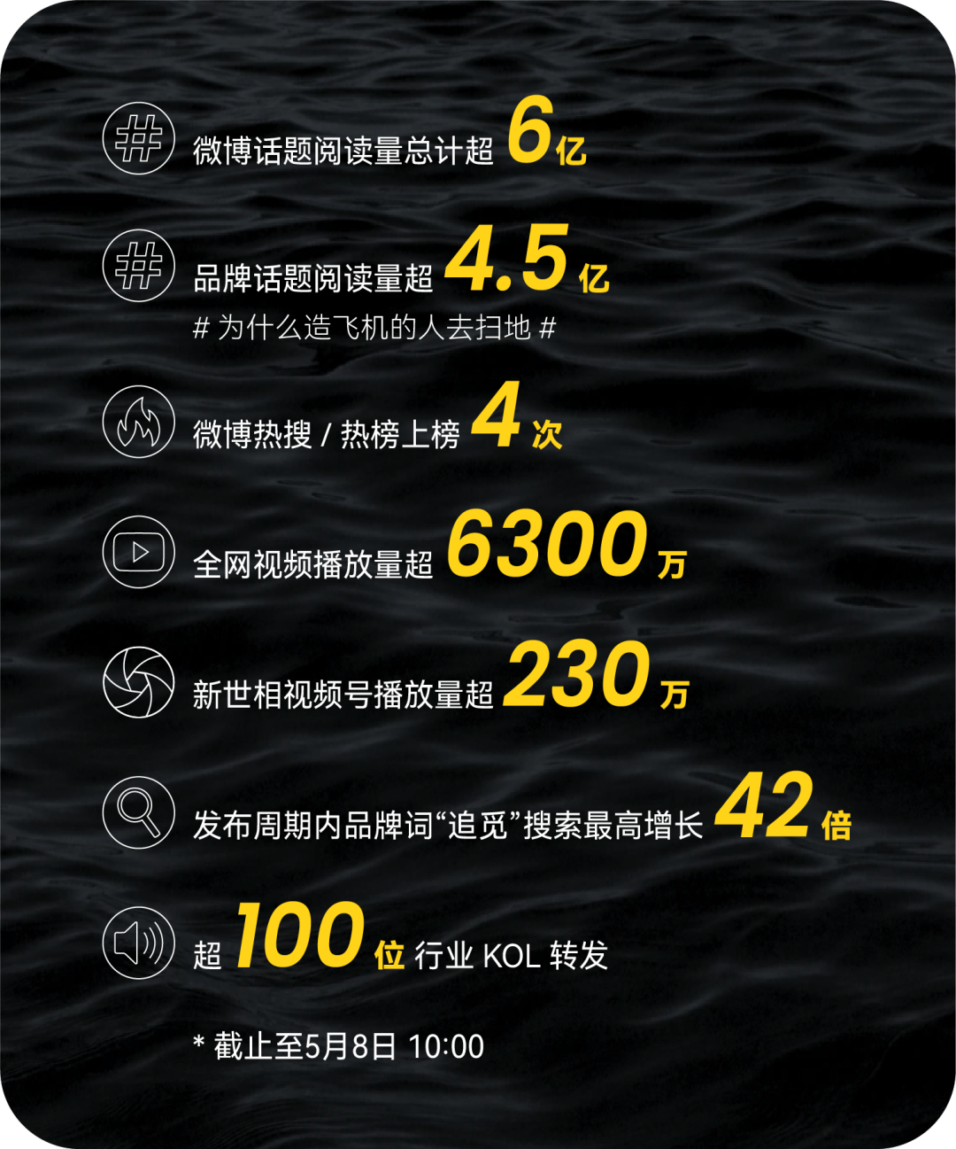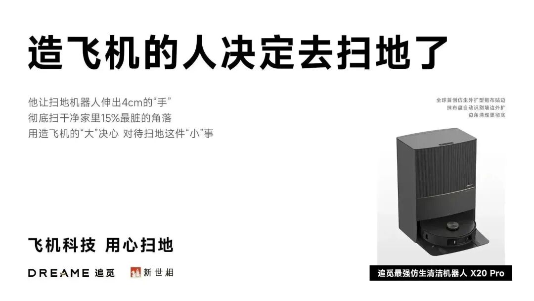 当你听到一台扫地机、吸尘器,是一个「造飞机的人」打造的,飞机的复杂性和技术难度,天然的会给追觅产品带来技术能力的背书。同时,「造飞机」和「扫地」两件事之间的反差感也很容易让人产生好奇——为什么造飞机的人去扫地?放着「大事」不错去做「小事」,追觅创始人的愿景是什么?这一社会议题同时具备新闻故事感、讨论度和悬疑感,品牌用活了新世相最擅长的部分,设置时代议题,让消费者只需要用一句话就记住了这个中国科技品牌。