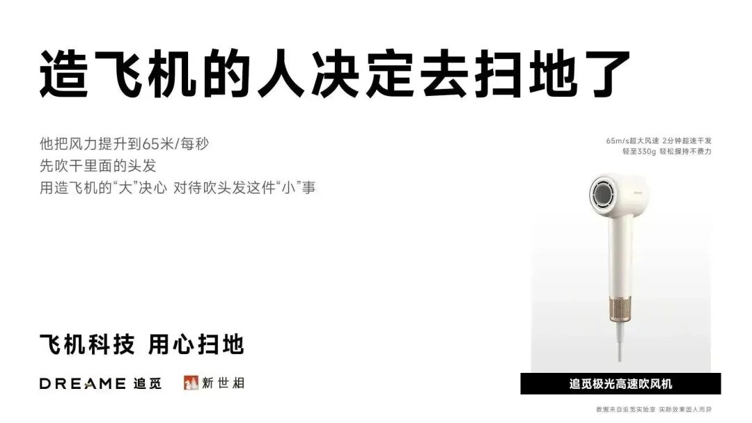 俞浩是一个非常有意思的创始人,他对新世相也提出了创新,希望能够将「造飞机的人去扫地」这一品牌认知策略深入到销售转化中,新世相也根据这一品牌要求,为品牌的销售转化端设计了全新的内容,例如更新追觅的线下和电商平台物料、更新直播平台的主播话术。比如主播在讲述新款吹风机特点时,新世相为追觅品牌设计的文案是「先吹干里面的头发」,直击长发女生的困扰。新世相从原来单纯的品牌塑造深入到品牌更深的转化环节。