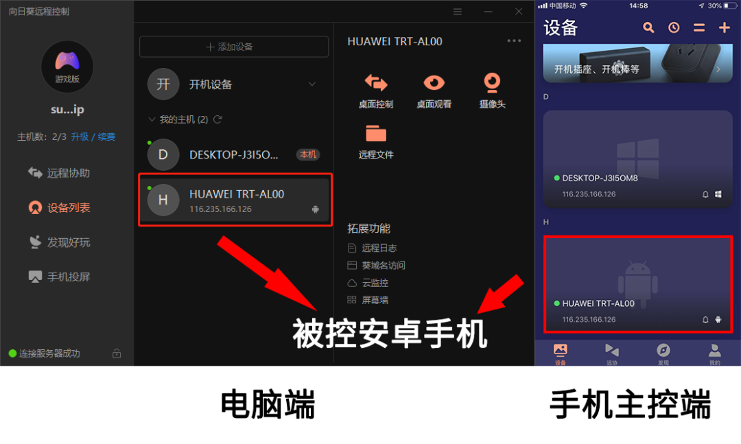 接下来就在主控端登陆同样的帐号,在主机列表/设备就能看到绑定的安卓手机。